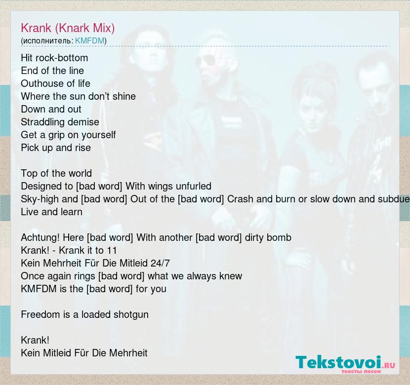 Hit rock-bottom End of the line Outhouse of life Where the sun don’t shine Down and out Straddling demise Get a grip on yourself Pick up and rise Top of the world Designed to destruct With wings unfurled Sky-high and [bad word] Out of the true Crash and burn or slow down and subdue Live and learn Achtung! Here we come With another [bad word] dirty bomb Krank! - Krank it to 11 Kein Mehrheit Für Die Mitleid 24/7 Once again rings true what we always knew KMFDM is the drug for you Freedom is a loaded shotgun Krank! Kein Mitleid Für Die Mehrheit