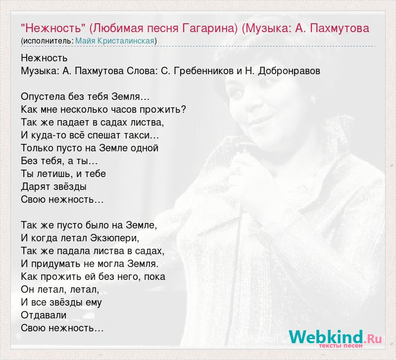 Нежность Музыка: А. Пахмутова Слова: С. Гребенников и Н. Добронравов Опустела без тебя Земля… Как мне несколько часов прожить? Так же падает в садах листва, И куда-то всё спешат такси… Только пусто на Земле одной Без тебя, а ты… Ты летишь, и тебе Дарят звёзды Свою нежность… Так же пусто было на Земле, И когда летал Экзюпери, Так же падала листва в садах, И придумать не могла Земля. Как прожить ей без него, пока Он летал, летал, И все звёзды ему Отдавали Свою нежность…