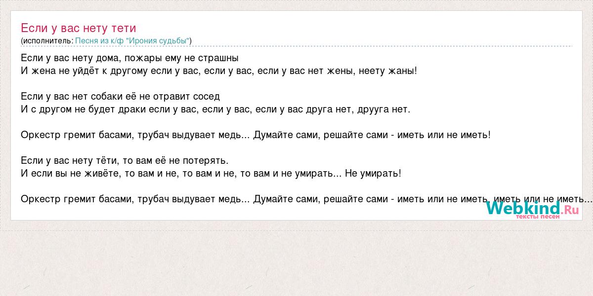 Если у вас нету дома, пожары ему не страшны И жена не уйдёт к другому если у вас, если у вас, если у вас нет жены, неету жаны! Если у вас нет собаки её не отравит сосед И с другом не будет драки если у вас, если у вас, если у вас друга нет, друуга нет. Оркестр гремит басами, трубач выдувает медь... Думайте сами, решайте сами - иметь или не иметь! Если у вас нету тёти, то вам её не потерять. И если вы не живёте, то вам и не, то вам и не, то вам и не умирать... Не умирать! Оркестр гремит басами, трубач выдувает медь... Думайте сами, решайте сами - иметь или не иметь, иметь или не иметь...