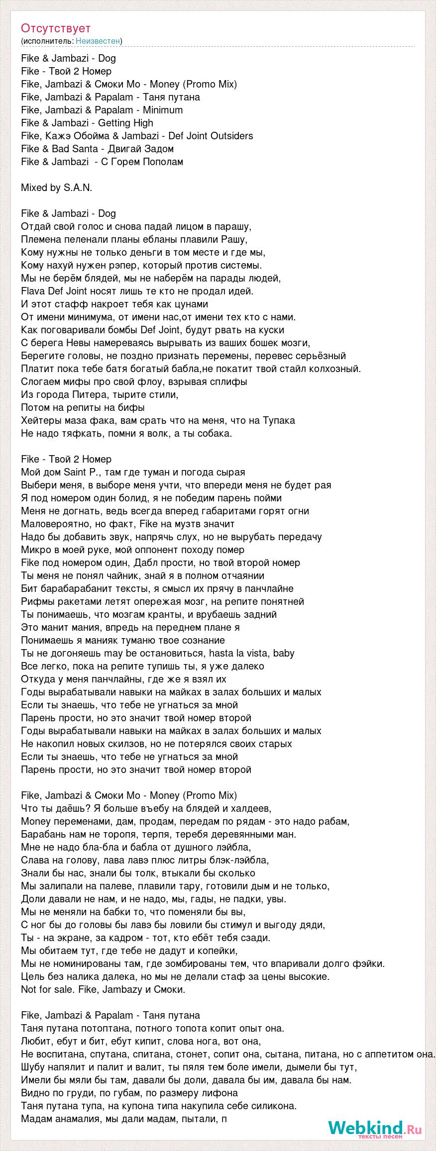 Fike & Jambazi - Dog Fike - Твой 2 Номер Fike, Jambazi & Смоки Мо - Money (Promo Mix) Fike, Jambazi & Papalam - Таня путана Fike, Jambazi & Papalam - Minimum Fike & Jambazi - Getting High Fike, Кажэ Обойма & Jambazi - Def Joint Outsiders Fike & Bad Santa - Двигай Задом Fike & Jambazi - С Горем Пополам Mixed by S.A.N. Fike & Jambazi - Dog Отдай свой голос и снова падай лицом в парашу, Племена пеленали планы ебланы плавили Рашу, Кому нужны не только деньги в том месте и где мы, Кому нахуй нужен рэпер, который против системы. Мы не берём блядей, мы не наберём на парады людей, Flava Def Joint носят лишь те кто не продал идей. И этот стафф накроет тебя как цунами От имени минимума, от имени нас,от имени тех кто с нами. Как поговаривали бомбы Def Joint, будут рвать на куски С берега Невы намереваясь вырывать из ваших бошек мозги, Берегите головы, не поздно признать перемены, перевес серьёзный Платит пока тебе батя богатый бабла,не покатит твой стайл колхозный. Слогаем мифы про свой флоу, взрывая сплифы Из города Питера, тырите стили, Потом на репиты на бифы Хейтеры маза фака, вам срать что на меня, что на Тупака Не надо тяфкать, помни я волк, а ты собака. Fike - Твой 2 Номер Мой дом Saint P., там где туман и погода сырая Выбери меня, в выборе меня учти, что впереди меня не будет рая Я под номером один болид, я не победим парень пойми Меня не догнать, ведь всегда вперед габаритами горят огни Маловероятно, но факт, Fike на музтв значит Надо бы добавить звук, напрячь слух, но не вырубать передачу Микро в моей руке, мой оппонент походу помер Fike под номером один, Дабл прости, но твой второй номер Ты меня не понял чайник, знай я в полном отчаянии Бит барабарабанит тексты, я смысл их прячу в панчлайне Рифмы ракетами летят опережая мозг, на репите понятней Ты понимаешь, что мозгам кранты, и врубаешь задний Это манит мания, впредь на переднем плане я Понимаешь я манияк туманю твое сознание Ты не догоняешь may be остановиться, hasta la vista, baby Все легко, пока на репите тупишь ты, я уже далеко Откуда у меня панчлайны, где же я взял их Годы вырабатывали навыки на майках в залах больших и малых Если ты знаешь, что тебе не угнаться за мной Парень прости, но это значит твой номер второй Годы вырабатывали навыки на майках в залах больших и малых Не накопил новых скилзов, но не потерялся своих старых Если ты знаешь, что тебе не угнаться за мной Парень прости, но это значит твой номер второй Fike, Jambazi & Смоки Мо - Money (Promo Mix) Что ты даёшь? Я больше въебу на блядей и халдеев, Money переменами, дам, продам, передам по рядам - это надо рабам, Барабань нам не торопя, терпя, теребя деревянными ман. Мне не надо бла-бла и бабла от душного лэйбла, Слава на голову, лава лавэ плюс литры блэк-лэйбла, Знали бы нас, знали бы толк, втыкали бы сколько Мы залипали на палеве, плавили тару, готовили дым и не только, Доли давали не нам, и не надо, мы, гады, не падки, увы. Мы не меняли на бабки то, что поменяли бы вы, С ног бы до головы бы лавэ бы ловили бы стимул и выгоду дяди, Ты - на экране, за кадром - тот, кто ебёт тебя сзади. Мы обитаем тут, где тебе не дадут и копейки, Мы не номинированы там, где зомбированы тем, что впаривали долго фэйки. Цель без налика далека, но мы не делали стаф за цены высокие. Not for sale. Fike, Jambazy и Смоки. Fike, Jambazi & Papalam - Таня путана Таня путана потоптана, потного топота копит опыт она. Любит, ебут и бит, ебут кипит, слова нога, вот она, Не воспитана, спутана, спитана, стонет, сопит она, сытана, питана, но с аппетитом она. Шубу напялит и палит и валит, ты пяля тем боле 