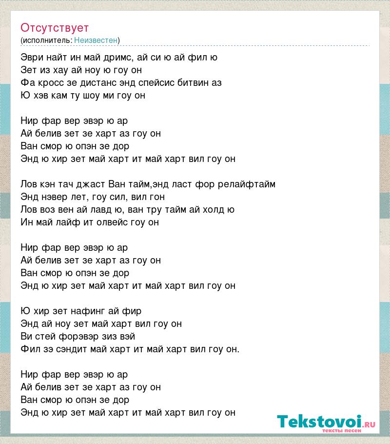 Эври найт ин май дримс, ай си ю ай фил ю Зет из хау ай ноу ю гоу он Фа кросс зе дистанс энд спейсис битвин аз Ю хэв кам ту шоу ми гоу он Нир фар вер эвэр ю ар Ай белив зет зе харт аз гоу он Ван смор ю опэн зе дор Энд ю хир зет май харт ит май харт вил гоу он Лов кэн тач джаст Ван тайм,энд ласт фор релайфтайм Энд нэвер лет, гоу сил, вил гон Лов воз вен ай лавд ю, ван тру тайм ай холд ю Ин май лайф ит олвейс гоу он Нир фар вер эвэр ю ар Ай белив зет зе харт аз гоу он Ван смор ю опэн зе дор Энд ю хир зет май харт ит май харт вил гоу он Ю хир зет нафинг ай фир Энд ай ноу зет май харт вил гоу он Ви стей форэвэр зиз вэй Фил зэ сэндит май харт ит май харт вил гоу он. Нир фар вер эвэр ю ар Ай белив зет зе харт аз гоу он Ван смор ю опэн зе дор Энд ю хир зет май харт ит май харт вил гоу он