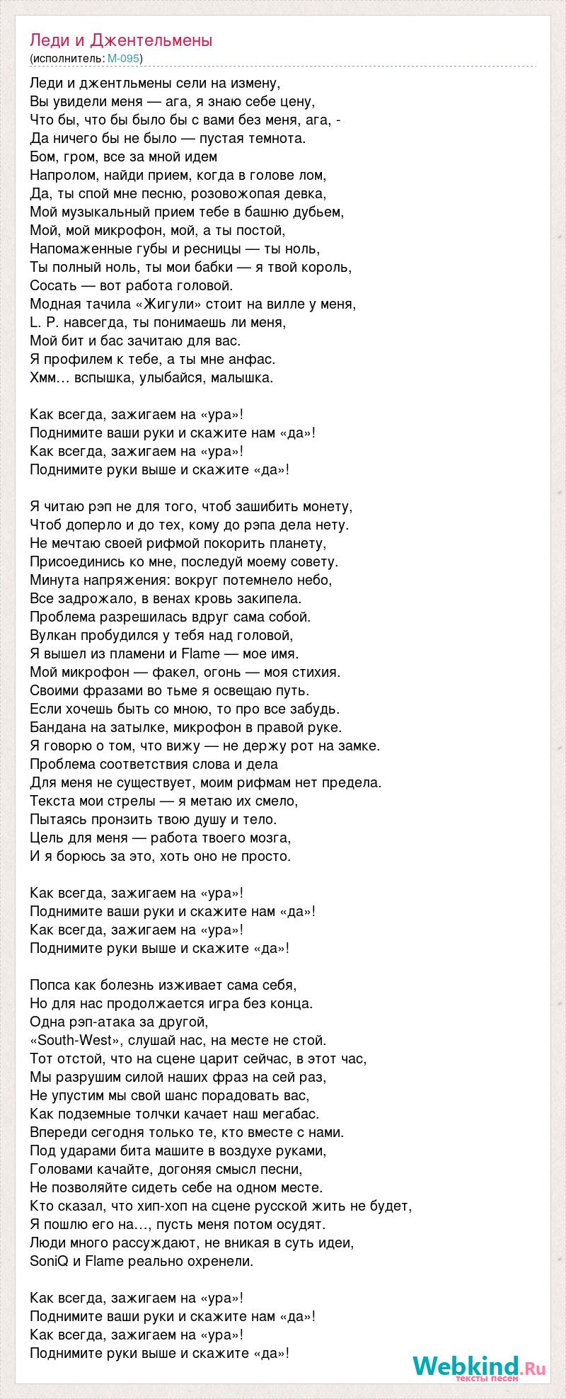 Леди и джентльмены сели на измену, Вы увидели меня — ага, я знаю себе цену, Что бы, что бы было бы с вами без меня, ага, - Да ничего бы не было — пустая темнота. Бом, гром, все за мной идем Напролом, найди прием, когда в голове лом, Да, ты спой мне песню, розовожопая девка, Мой музыкальный прием тебе в башню дубьем, Мой, мой микрофон, мой, а ты постой, Напомаженные губы и ресницы — ты ноль, Ты полный ноль, ты мои бабки — я твой король, Сосать — вот работа головой. Модная тачила «Жигули» стоит на вилле у меня, L. P. навсегда, ты понимаешь ли меня, Мой бит и бас зачитаю для вас. Я профилем к тебе, а ты мне анфас. Хмм… вспышка, улыбайся, малышка. Как всегда, зажигаем на «ура»! Поднимите ваши руки и скажите нам «да»! Как всегда, зажигаем на «ура»! Поднимите руки выше и скажите «да»! Я читаю рэп не для того, чтоб зашибить монету, Чтоб доперло и до тех, кому до рэпа дела нету. Не мечтаю своей рифмой покорить планету, Присоединись ко мне, последуй моему совету. Минута напряжения: вокруг потемнело небо, Все задрожало, в венах кровь закипела. Проблема разрешилась вдруг сама собой. Вулкан пробудился у тебя над головой, Я вышел из пламени и Flame — мое имя. Мой микрофон — факел, огонь — моя стихия. Своими фразами во тьме я освещаю путь. Если хочешь быть со мною, то про все забудь. Бандана на затылке, микрофон в правой руке. Я говорю о том, что вижу — не держу рот на замке. Проблема соответствия слова и дела Для меня не существует, моим рифмам нет предела. Текста мои стрелы — я метаю их смело, Пытаясь пронзить твою душу и тело. Цель для меня — работа твоего мозга, И я борюсь за это, хоть оно не просто. Как всегда, зажигаем на «ура»! Поднимите ваши руки и скажите нам «да»! Как всегда, зажигаем на «ура»! Поднимите руки выше и скажите «да»! Попса как болезнь изживает сама себя, Но для нас продолжается игра без конца. Одна рэп-атака за другой, «South-West», слушай нас, на месте не стой. Тот отстой, что на сцене царит сейчас, в этот час, Мы разрушим силой наших фраз на сей раз, Не упустим мы свой шанс порадовать вас, Как подземные толчки качает наш мегабас. Впереди сегодня только те, кто вместе с нами. Под ударами бита машите в воздухе руками, Головами качайте, догоняя смысл песни, Не позволяйте сидеть себе на одном месте. Кто сказал, что хип-хоп на сцене русской жить не будет, Я пошлю его на…, пусть меня потом осудят. Люди много рассуждают, не вникая в суть идеи, SoniQ и Flame реально охренели. Как всегда, зажигаем на «ура»! Поднимите ваши руки и скажите нам «да»! Как всегда, зажигаем на «ура»! Поднимите руки выше и скажите «да»!