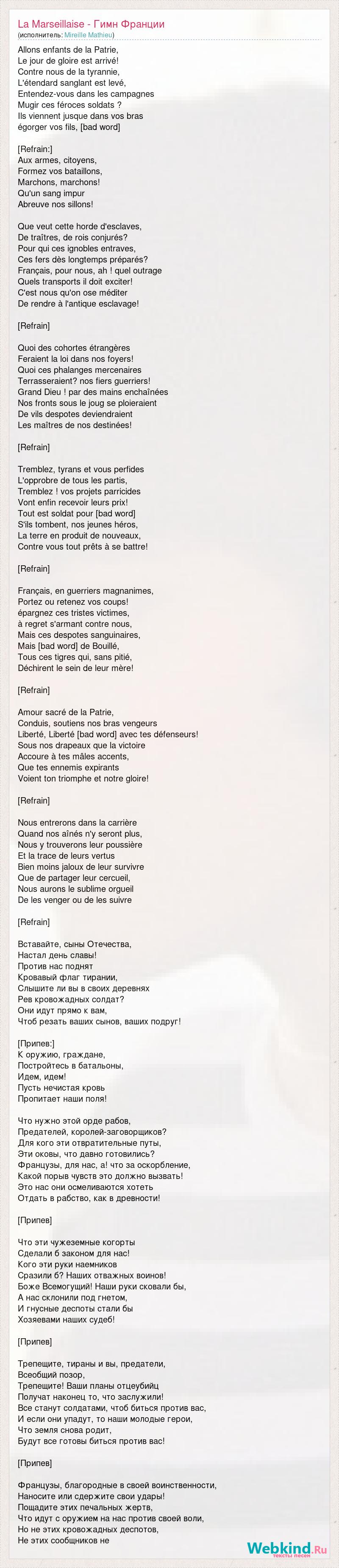 Allons enfants de la Patrie, Le jour de gloire est arrivé! Contre nous de la tyrannie, L'étendard sanglant est levé, Entendez-vous dans les campagnes Mugir ces féroces soldats ? Ils viennent jusque dans vos bras égorger vos fils, [bad word] [Refrain:] Aux armes, citoyens, Formez vos bataillons, Marchons, marchons! Qu'un sang impur Abreuve nos sillons! Que veut cette horde d'esclaves, De traîtres, de rois conjurés? Pour qui ces ignobles entraves, Ces fers dès longtemps préparés? Français, pour nous, ah ! quel outrage Quels transports il doit exciter! C'est nous qu'on ose méditer De rendre à l'antique esclavage! [Refrain] Quoi des cohortes étrangères Feraient la loi dans nos foyers! Quoi ces phalanges mercenaires Terrasseraient? nos fiers guerriers! Grand Dieu ! par des mains enchaînées Nos fronts sous le joug se ploieraient De vils despotes deviendraient Les maîtres de nos destinées! [Refrain] Tremblez, tyrans et vous perfides L'opprobre de tous les partis, Tremblez ! vos projets parricides Vont enfin recevoir leurs prix! Tout est soldat pour [bad word] S'ils tombent, nos jeunes héros, La terre en produit de nouveaux, Contre vous tout prêts à se battre! [Refrain] Français, en guerriers magnanimes, Portez ou retenez vos coups! épargnez ces tristes victimes, à regret s'armant contre nous, Mais ces despotes sanguinaires, Mais [bad word] de Bouillé, Tous ces tigres qui, sans pitié, Déchirent le sein de leur mère! [Refrain] Amour sacré de la Patrie, Conduis, soutiens nos bras vengeurs Liberté, Liberté [bad word] avec tes défenseurs! Sous nos drapeaux que la victoire Accoure à tes mâles accents, Que tes ennemis expirants Voient ton triomphe et notre gloire! [Refrain] Nous entrerons dans la carrière Quand nos aînés n'y seront plus, Nous y trouverons leur poussière Et la trace de leurs vertus Bien moins jaloux de leur survivre Que de partager leur cercueil, Nous aurons le sublime orgueil De les venger ou de les suivre [Refrain] Вставайте, сыны Отечества, Настал день славы! Против нас поднят Кровавый флаг тирании, Слышите ли вы в своих деревнях Рев кровожадных солдат? Они идут прямо к вам, Чтоб резать ваших сынов, ваших подруг! [Припев:] К оружию, граждане, Постройтесь в батальоны, Идем, идем! Пусть нечистая кровь Пропитает наши поля! Что нужно этой орде рабов, Предателей, королей-заговорщиков? Для кого эти отвратительные путы, Эти оковы, что давно готовились? Французы, для нас, а! что за оскорбление, Какой порыв чувств это должно вызвать! Это нас они осмеливаются хотеть Отдать в рабство, как в древности! [Припев] Что эти чужеземные когорты Сделали б законом для нас! Кого эти руки наемников Сразили б? Наших отважных воинов! Боже Всемогущий! Наши руки сковали бы, А нас склонили под гнетом, И гнусные деспоты стали бы Хозяевами наших судеб! [Припев] Трепещите, тираны и вы, предатели, Всеобщий позор, Трепещите! Ваши планы отцеубийц Получат наконец то, что заслужили! Все станут солдатами, чтоб биться против вас, И если они упадут, то наши молодые герои, Что земля снова родит, Будут все готовы биться против вас! [Припев] Французы, благородные в своей воинственности, Наносите или сдержите свои удары! Пощадите этих печальных жертв, Что идут с оружием на нас против своей воли, Но не этих кровожадных деспотов, Не этих сообщников не