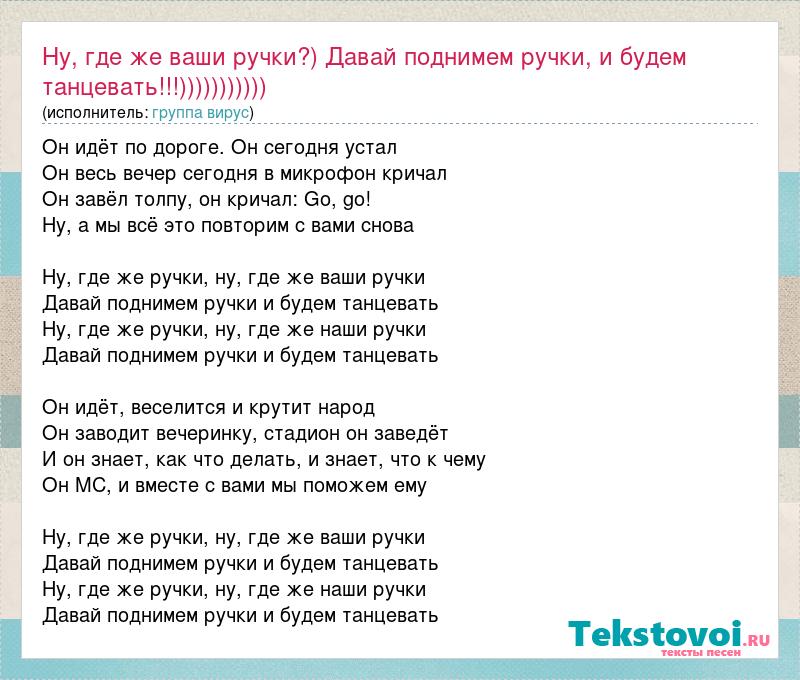 Он идёт по дороге. Он сегодня устал Он весь вечер сегодня в микрофон кричал Он завёл толпу, он кричал: Go, go! Ну, а мы всё это повторим с вами снова Ну, где же ручки, ну, где же ваши ручки Давай поднимем ручки и будем танцевать Ну, где же ручки, ну, где же наши ручки Давай поднимем ручки и будем танцевать Он идёт, веселится и крутит народ Он заводит вечеринку, стадион он заведёт И он знает, как что делать, и знает, что к чему Он MC, и вместе с вами мы поможем ему Ну, где же ручки, ну, где же ваши ручки Давай поднимем ручки и будем танцевать Ну, где же ручки, ну, где же наши ручки Давай поднимем ручки и будем танцевать