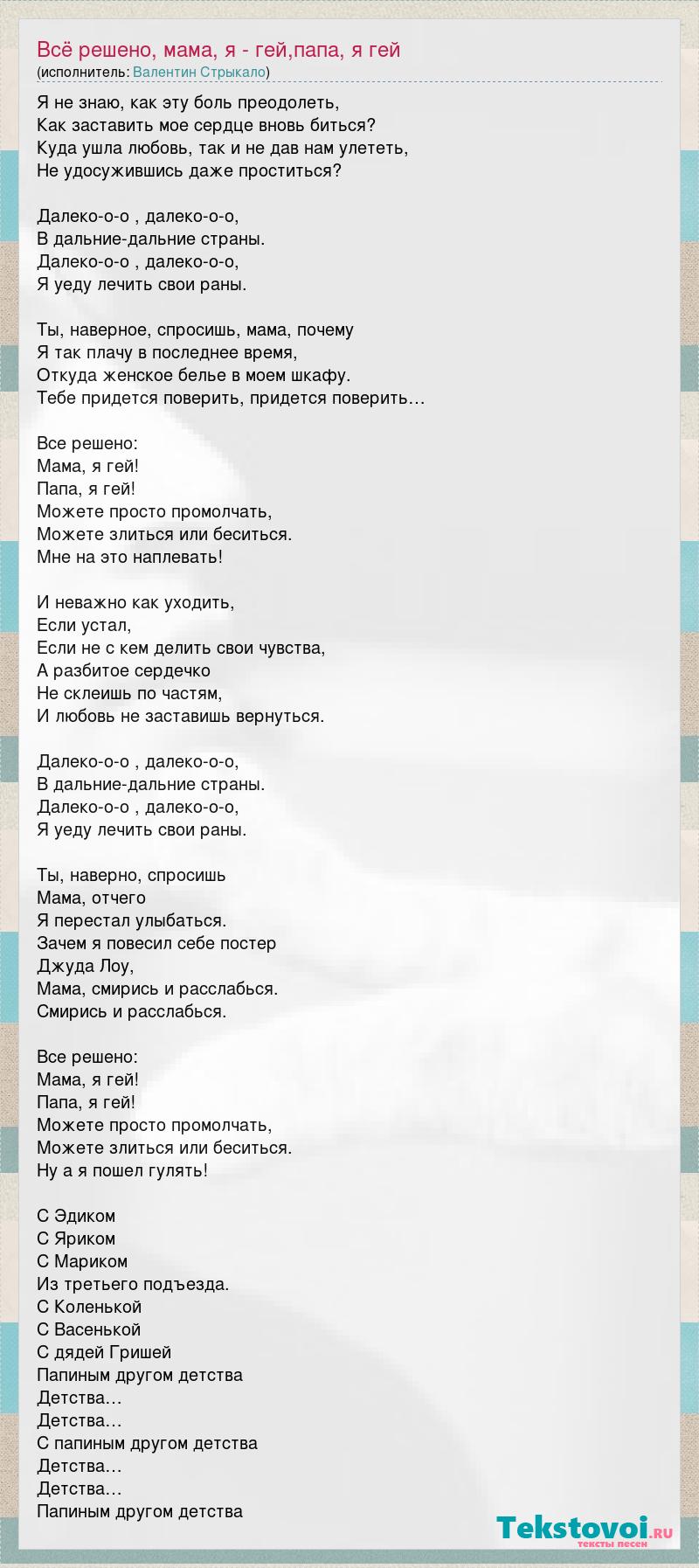 Я не знаю, как эту боль преодолеть, Как заставить мое сердце вновь биться? Куда ушла любовь, так и не дав нам улететь, Не удосужившись даже проститься? Далеко-о-о , далеко-о-о, В дальние-дальние страны. Далеко-о-о , далеко-о-о, Я уеду лечить свои раны. Ты, наверное, спросишь, мама, почему Я так плачу в последнее время, Откуда женское белье в моем шкафу. Тебе придется поверить, придется поверить… Все решено: Мама, я гей! Папа, я гей! Можете просто промолчать, Можете злиться или беситься. Мне на это наплевать! И неважно как уходить, Если устал, Если не с кем делить свои чувства, А разбитое сердечко Не склеишь по частям, И любовь не заставишь вернуться. Далеко-о-о , далеко-о-о, В дальние-дальние страны. Далеко-о-о , далеко-о-о, Я уеду лечить свои раны. Ты, наверно, спросишь Мама, отчего Я перестал улыбаться. Зачем я повесил себе постер Джуда Лоу, Мама, смирись и расслабься. Смирись и расслабься. Все решено: Мама, я гей! Папа, я гей! Можете просто промолчать, Можете злиться или беситься. Ну а я пошел гулять! С Эдиком С Яриком С Мариком Из третьего подъезда. С Коленькой С Васенькой С дядей Гришей Папиным другом детства Детства… Детства… С папиным другом детства Детства… Детства… Папиным другом детства
