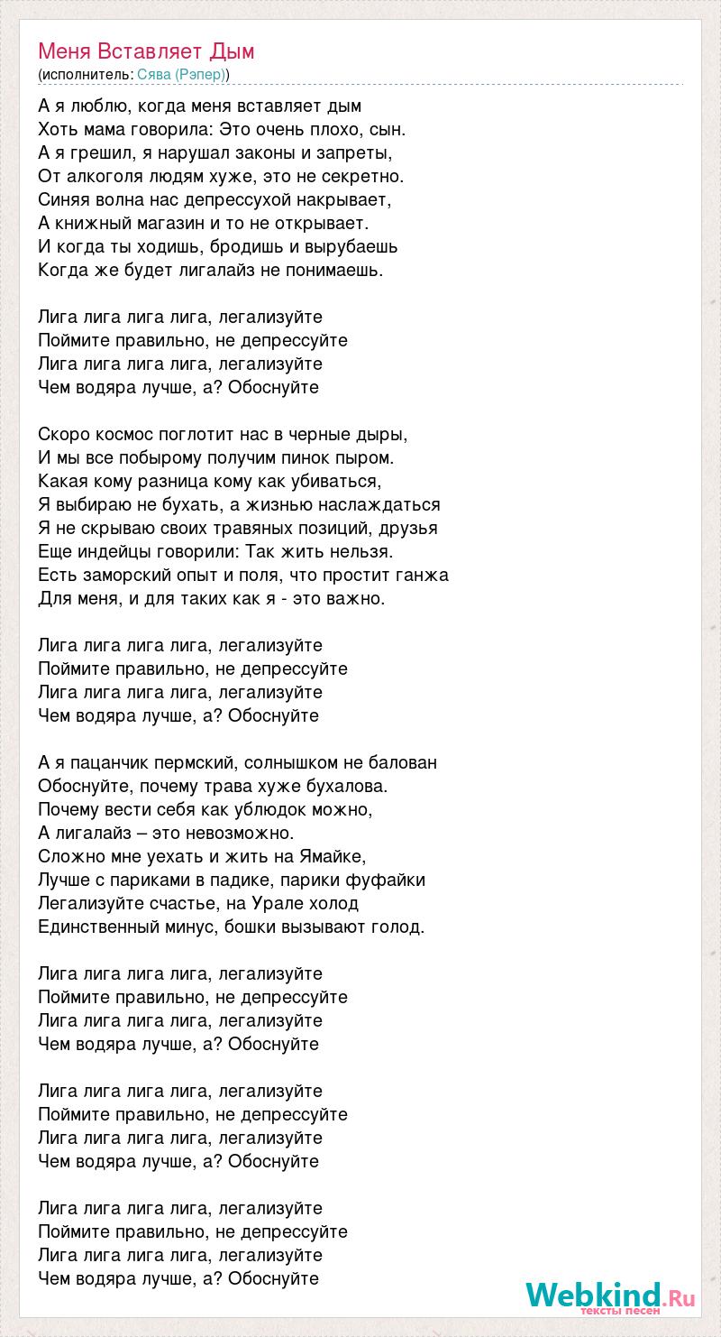 А я люблю, когда меня вставляет дым Хоть мама говорила: Это очень плохо, сын. А я грешил, я нарушал законы и запреты, От алкоголя людям хуже, это не секретно. Синяя волна нас депрессухой накрывает, А книжный магазин и то не открывает. И когда ты ходишь, бродишь и вырубаешь Когда же будет лигалайз не понимаешь. Лига лига лига лига, легализуйте Поймите правильно, не депрессуйте Лига лига лига лига, легализуйте Чем водяра лучше, а? Обоснуйте Скоро космос поглотит нас в черные дыры, И мы все побырому получим пинок пыром. Какая кому разница кому как убиваться, Я выбираю не бухать, а жизнью наслаждаться Я не скрываю своих травяных позиций, друзья Еще индейцы говорили: Так жить нельзя. Есть заморский опыт и поля, что простит ганжа Для меня, и для таких как я - это важно. Лига лига лига лига, легализуйте Поймите правильно, не депрессуйте Лига лига лига лига, легализуйте Чем водяра лучше, а? Обоснуйте А я пацанчик пермский, солнышком не балован Обоснуйте, почему трава хуже бухалова. Почему вести себя как ублюдок можно, А лигалайз – это невозможно. Сложно мне уехать и жить на Ямайке, Лучше с париками в падике, парики фуфайки Легализуйте счастье, на Урале холод Единственный минус, бошки вызывают голод. Лига лига лига лига, легализуйте Поймите правильно, не депрессуйте Лига лига лига лига, легализуйте Чем водяра лучше, а? Обоснуйте Лига лига лига лига, легализуйте Поймите правильно, не депрессуйте Лига лига лига лига, легализуйте Чем водяра лучше, а? Обоснуйте Лига лига лига лига, легализуйте Поймите правильно, не депрессуйте Лига лига лига лига, легализуйте Чем водяра лучше, а? Обоснуйте