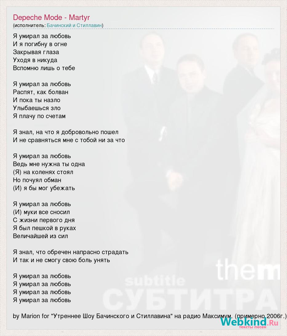 Я умирал за любовь И я погибну в огне Закрывая глаза Уходя в никуда Вспомню лишь о тебе Я умирал за любовь Распят, как болван И пока ты назло Улыбаешься зло Я плачу по счетам Я знал, на что я добровольно пошел И не сравняться мне с тобой ни за что Я умирал за любовь Ведь мне нужна ты одна (Я) на коленях стоял Но почуял обман (И) я бы мог убежать Я умирал за любовь (И) муки все сносил С жизни первого дня Я был пешкой в руках Величайшей из сил Я знал, что обречен напрасно страдать И так и не смогу свою боль унять Я умирал за любовь Я умирал за любовь Я умирал за любовь Я умирал за любовь by Marion for "Утреннее Шоу Бачинского и Стиллавина" на радио Максимум. (примерно 2006г.)