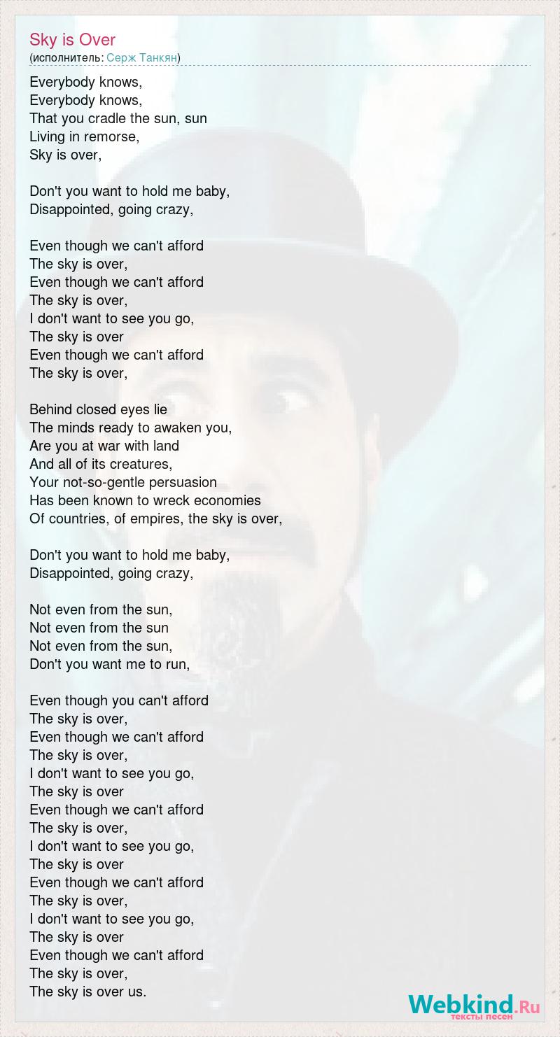 Everybody knows, Everybody knows, That you cradle the sun, sun Living in remorse, Sky is over, Don't you want to hold me baby, Disappointed, going crazy, Even though we can't afford The sky is over, Even though we can't afford The sky is over, I don't want to see you go, The sky is over Even though we can't afford The sky is over, Behind closed eyes lie The minds ready to awaken you, Are you at war with land And all of its creatures, Your not-so-gentle persuasion Has been known to wreck economies Of countries, of empires, the sky is over, Don't you want to hold me baby, Disappointed, going crazy, Not even from the sun, Not even from the sun Not even from the sun, Don't you want me to run, Even though you can't afford The sky is over, Even though we can't afford The sky is over, I don't want to see you go, The sky is over Even though we can't afford The sky is over, I don't want to see you go, The sky is over Even though we can't afford The sky is over, I don't want to see you go, The sky is over Even though we can't afford The sky is over, The sky is over us.