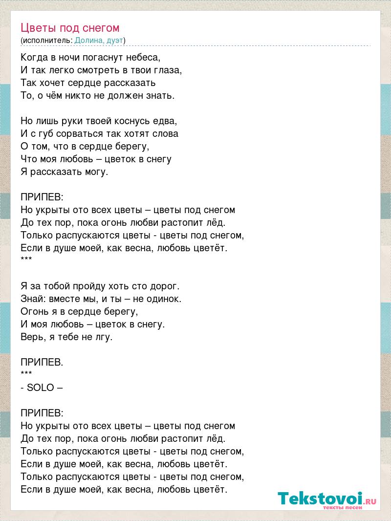 Когда в ночи погаснут небеса, И так легко смотреть в твои глаза, Так хочет сердце рассказать То, о чём никто не должен знать. Но лишь руки твоей коснусь едва, И с губ сорваться так хотят слова О том, что в сердце берегу, Что моя любовь – цветок в снегу Я рассказать могу. ПРИПЕВ: Но укрыты ото всех цветы – цветы под снегом До тех пор, пока огонь любви растопит лёд. Только распускаются цветы - цветы под снегом, Если в душе моей, как весна, любовь цветёт. *** Я за тобой пройду хоть сто дорог. Знай: вместе мы, и ты – не одинок. Огонь я в сердце берегу, И моя любовь – цветок в снегу. Верь, я тебе не лгу. ПРИПЕВ. *** - SOLO – ПРИПЕВ: Но укрыты ото всех цветы – цветы под снегом До тех пор, пока огонь любви растопит лёд. Только распускаются цветы - цветы под снегом, Если в душе моей, как весна, любовь цветёт. Только распускаются цветы - цветы под снегом, Если в душе моей, как весна, любовь цветёт.