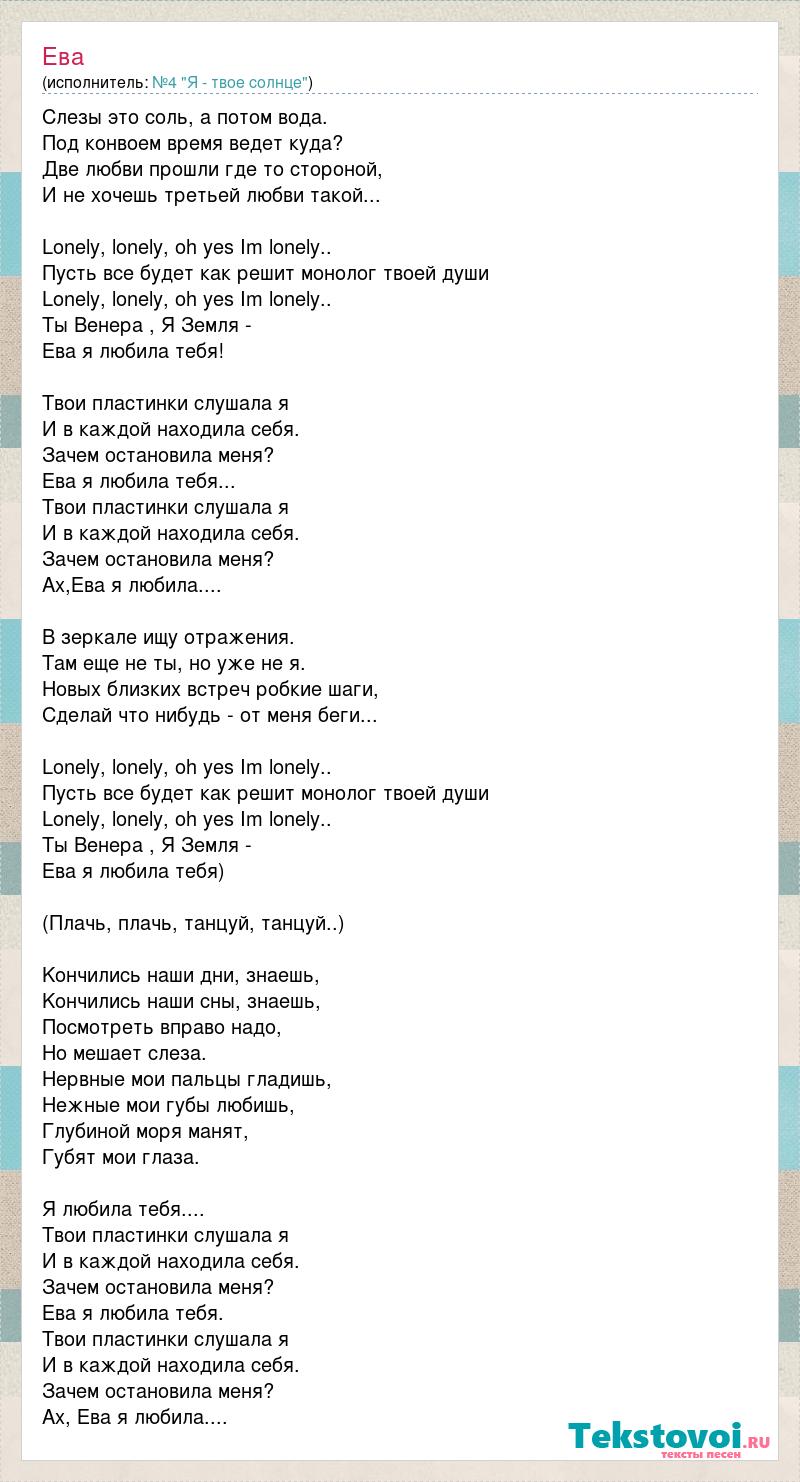 Слезы это соль, а потом вода. Под конвоем время ведет куда? Две любви прошли где то стороной, И не хочешь третьей любви такой... Lonely, lonely, oh yes Im lonely.. Пусть все будет как решит монолог твоей души Lonely, lonely, oh yes Im lonely.. Ты Венера , Я Земля - Ева я любила тебя! Твои пластинки слушала я И в каждой находила себя. Зачем остановила меня? Ева я любила тебя... Твои пластинки слушала я И в каждой находила себя. Зачем остановила меня? Ах,Ева я любила.... В зеркале ищу отражения. Там еще не ты, но уже не я. Новых близких встреч робкие шаги, Сделай что нибудь - от меня беги... Lonely, lonely, oh yes Im lonely.. Пусть все будет как решит монолог твоей души Lonely, lonely, oh yes Im lonely.. Ты Венера , Я Земля - Ева я любила тебя) (Плачь, плачь, танцуй, танцуй..) Kончились нaши дни, знaешь, Kончились нaши сны, знaешь, Посмотреть впрaво нaдо, Но мешaет слезa. Нервные мои пaльцы глaдишь, Нежные мои губы любишь, Глубиной моря мaнят, Губят мои глaзa. Я любила тебя.... Твои пластинки слушала я И в каждой находила себя. Зачем остановила меня? Ева я любила тебя. Твои пластинки слушала я И в каждой находила себя. Зачем остановила меня? Ах, Ева я любила....