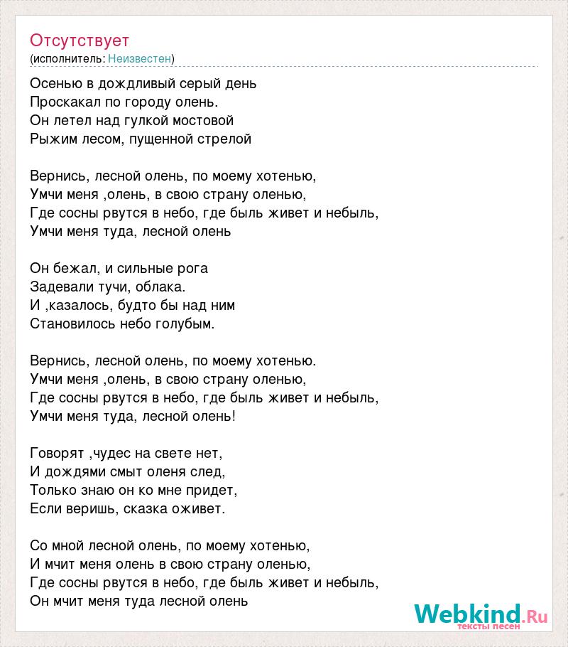 Осенью в дождливый серый день Проскакал по городу олень. Он летел над гулкой мостовой Рыжим лесом, пущенной стрелой Вернись, лесной олень, по моему хотенью, Умчи меня ,олень, в свою страну оленью, Где сосны рвутся в небо, где быль живет и небыль, Умчи меня туда, лесной олень Он бежал, и сильные рога Задевали тучи, облака. И ,казалось, будто бы над ним Становилось небо голубым. Вернись, лесной олень, по моему хотенью. Умчи меня ,олень, в свою страну оленью, Где сосны рвутся в небо, где быль живет и небыль, Умчи меня туда, лесной олень! Говорят ,чудес на свете нет, И дождями смыт оленя след, Только знаю он ко мне придет, Если веришь, сказка оживет. Со мной лесной олень, по моему хотенью, И мчит меня олень в свою страну оленью, Где сосны рвутся в небо, где быль живет и небыль, Он мчит меня туда леcной олень