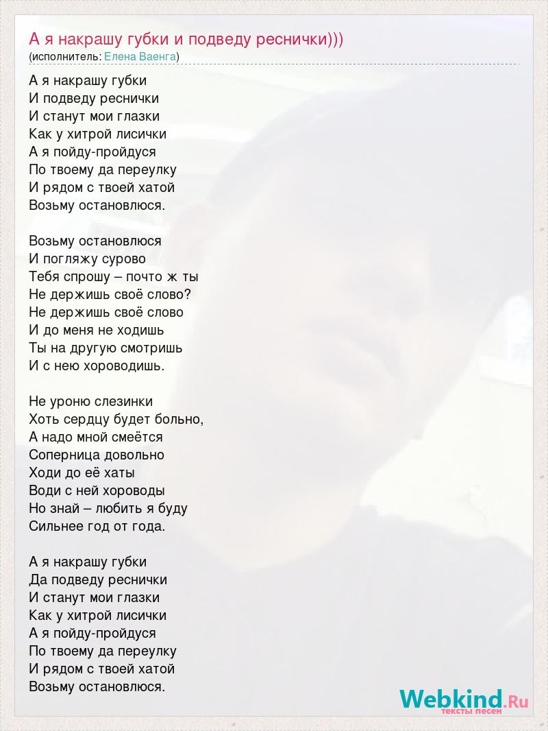 А я накрашу губки И подведу реснички И станут мои глазки Как у хитрой лисички А я пойду-пройдуся По твоему да переулку И рядом с твоей хатой Возьму остановлюся. Возьму остановлюся И погляжу сурово Тебя спрошу – почто ж ты Не держишь своё слово? Не держишь своё слово И до меня не ходишь Ты на другую смотришь И с нею хороводишь. Не уроню слезинки Хоть сердцу будет больно, А надо мной смеётся Соперница довольно Ходи до её хаты Води с ней хороводы Но знай – любить я буду Сильнее год от года. А я накрашу губки Да подведу реснички И станут мои глазки Как у хитрой лисички А я пойду-пройдуся По твоему да переулку И рядом с твоей хатой Возьму остановлюся.