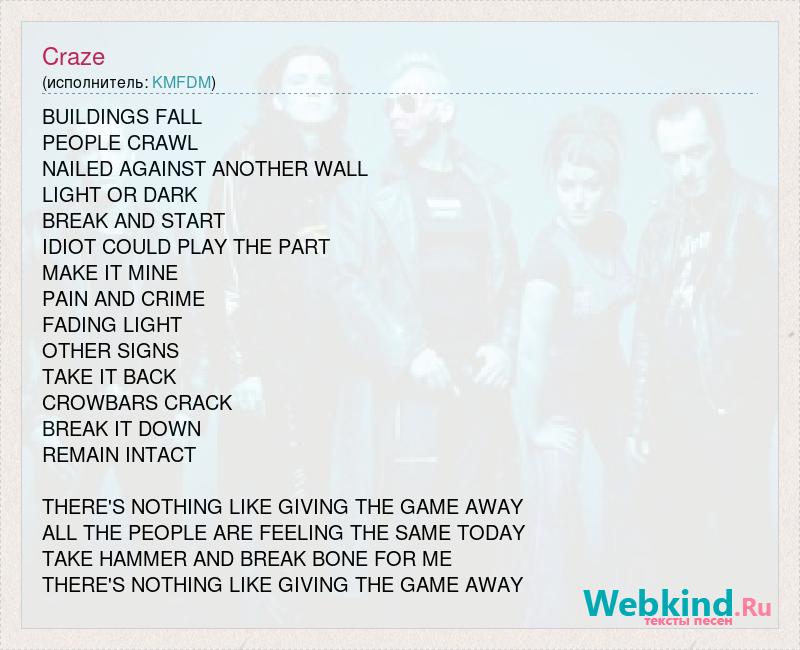 BUILDINGS FALL PEOPLE CRAWL NAILED AGAINST ANOTHER WALL LIGHT OR DARK BREAK AND START IDIOT COULD PLAY THE PART MAKE IT MINE PAIN AND CRIME FADING LIGHT OTHER SIGNS TAKE IT BACK CROWBARS CRACK BREAK IT DOWN REMAIN INTACT THERE'S NOTHING LIKE GIVING THE GAME AWAY ALL THE PEOPLE ARE FEELING THE SAME TODAY TAKE HAMMER AND BREAK BONE FOR ME THERE'S NOTHING LIKE GIVING THE GAME AWAY