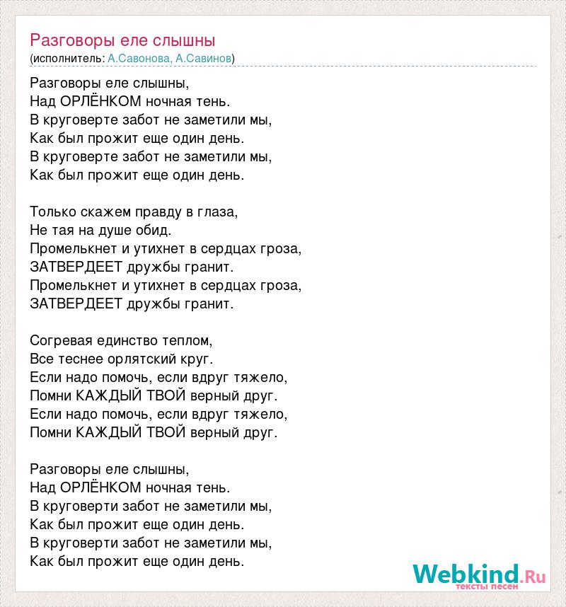 Разговоры еле слышны, Над ОРЛЁНКОМ ночная тень. В круговерте забот не заметили мы, Как был прожит еще один день. В круговерте забот не заметили мы, Как был прожит еще один день. Только скажем правду в глаза, Не тая на душе обид. Промелькнет и утихнет в сердцах гроза, ЗАТВЕРДЕЕТ дружбы гранит. Промелькнет и утихнет в сердцах гроза, ЗАТВЕРДЕЕТ дружбы гранит. Согревая единство теплом, Все теснее орлятский круг. Если надо помочь, если вдруг тяжело, Помни КАЖДЫЙ ТВОЙ верный друг. Если надо помочь, если вдруг тяжело, Помни КАЖДЫЙ ТВОЙ верный друг. Разговоры еле слышны, Над ОРЛЁНКОМ ночная тень. В круговерти забот не заметили мы, Как был прожит еще один день. В круговерти забот не заметили мы, Как был прожит еще один день.