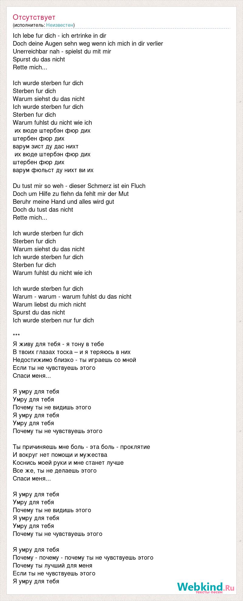 Ich lebe fur dich - ich ertrinke in dir Doch deine Augen sehn weg wenn ich mich in dir verlier Unerreichbar nah - spielst du mit mir Spurst du das nicht Rette mich... Ich wurde sterben fur dich Sterben fur dich Warum siehst du das nicht Ich wurde sterben fur dich Sterben fur dich Warum fuhlst du nicht wie ich их вюде штербэн фюр дих штербен фюр дих варум зист ду дас нихт их вюде штербэн фюр дих штербен фюр дих варум фюльст ду нихт ви их Du tust mir so weh - dieser Schmerz ist ein Fluch Doch um Hilfe zu flehn da fehlt mir der Mut Beruhr meine Hand und alles wird gut Doch du tust das nicht Rette mich... Ich wurde sterben fur dich Sterben fur dich Warum siehst du das nicht Ich wurde sterben fur dich Sterben fur dich Warum fuhlst du nicht wie ich Ich wurde sterben fur dich Warum - warum - warum fuhlst du das nicht Warum liebst du mich nicht Spurst du das nicht Ich wurde sterben nur fur dich *** Я живу для тебя - я тону в тебе В твоих глазах тоска – и я теряюсь в них Недостижимо близко - ты играешь со мной Если ты не чувствуешь этого Спаси меня... Я умру для тебя Умру для тебя Почему ты не видишь этого Я умру для тебя Умру для тебя Почему ты не чувствуешь этого Ты причиняешь мне боль - эта боль - проклятие И вокруг нет помощи и мужества Коснись моей руки и мне станет лучше Все же, ты не делаешь этого Спаси меня... Я умру для тебя Умру для тебя Почему ты не видишь этого Я умру для тебя Умру для тебя Почему ты не чувствуешь этого Я умру для тебя Почему - почему - почему ты не чувствуешь этого Почему ты лучший для меня Если ты не чувствуешь этого Я умру для тебя