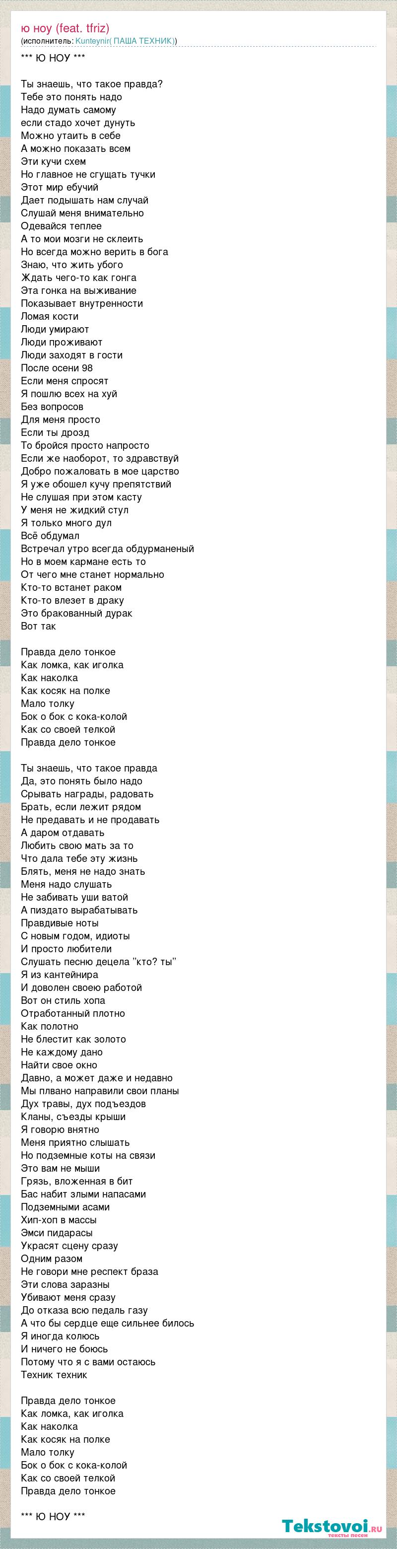*** Ю НОУ *** Ты знаешь, что такое правда? Тебе это понять надо Надо думать самому если стадо хочет дунуть Можно утаить в себе А можно показать всем Эти кучи схем Но главное не сгущать тучки Этот мир ебучий Дает подышать нам случай Слушай меня внимательно Одевайся теплее А то мои мозги не склеить Но всегда можно верить в бога Знаю, что жить убого Ждать чего-то как гонга Эта гонка на выживание Показывает внутренности Ломая кости Люди умирают Люди проживают Люди заходят в гости После осени 98 Если меня спросят Я пошлю всех на хуй Без вопросов Для меня просто Если ты дрозд То бройся просто напросто Если же наоборот, то здравствуй Добро пожаловать в мое царство Я уже обошел кучу препятствий Не слушая при этом касту У меня не жидкий стул Я только много дул Всё обдумал Встречал утро всегда обдурманеный Но в моем кармане есть то От чего мне станет нормально Кто-то встанет раком Кто-то влезет в драку Это бракованный дурак Вот так Правда дело тонкое Как ломка, как иголка Как наколка Как косяк на полке Мало толку Бок о бок с кока-колой Как со своей телкой Правда дело тонкое Ты знаешь, что такое правда Да, это понять было надо Срывать награды, радовать Брать, если лежит рядом Не предавать и не продавать А даром отдавать Любить свою мать за то Что дала тебе эту жизнь Блять, меня не надо знать Меня надо слушать Не забивать уши ватой А пиздато вырабатывать Правдивые ноты С новым годом, идиоты И просто любители Слушать песню децела ’’кто? ты’’ Я из кантейнира И доволен своею работой Вот он стиль хопа Отработанный плотно Как полотно Не блестит как золото Не каждому дано Найти свое окно Давно, а может даже и недавно Мы плвано направили свои планы Дух травы, дух подъездов Кланы, съезды крыши Я говорю внятно Меня приятно слышать Но подземные коты на связи Это вам не мыши Грязь, вложенная в бит Бас набит злыми напасами Подземными асами Хип-хоп в массы Эмси пидарасы Украсят сцену сразу Одним разом Не говори мне респект браза Эти слова заразны Убивают меня сразу До отказа всю педаль газу А что бы сердце еще сильнее билось Я иногда колюсь И ничего не боюсь Потому что я с вами остаюсь Техник техник Правда дело тонкое Как ломка, как иголка Как наколка Как косяк на полке Мало толку Бок о бок с кока-колой Как со своей телкой Правда дело тонкое *** Ю НОУ ***