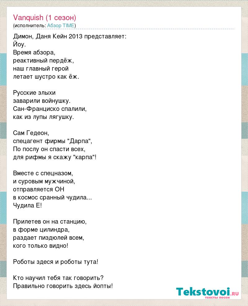 Димон, Даня Кейн 2013 представляет: Йоу. Время абзора, реактивный пердёж, наш главный герой летает шустро как ёж. Русские злыхи заварили войнушку. Сан-Франциско спалили, как из лупы лягушку. Сам Гедеон, спецагент фирмы "Дарпа", По послу он спасти всех, для рифмы я скажу "карпа"! Вместе с спецназом, и суровым мужчиной, отправляется ОН в космос сранный чудила... Чудила Е! Прилетев он на станцию, в форме цилиндра, раздает пиздюлей всем, кого только видно! Роботы здеся и роботы тута! Кто научил тебя так говорить? Правильно говорить здесь йопты!