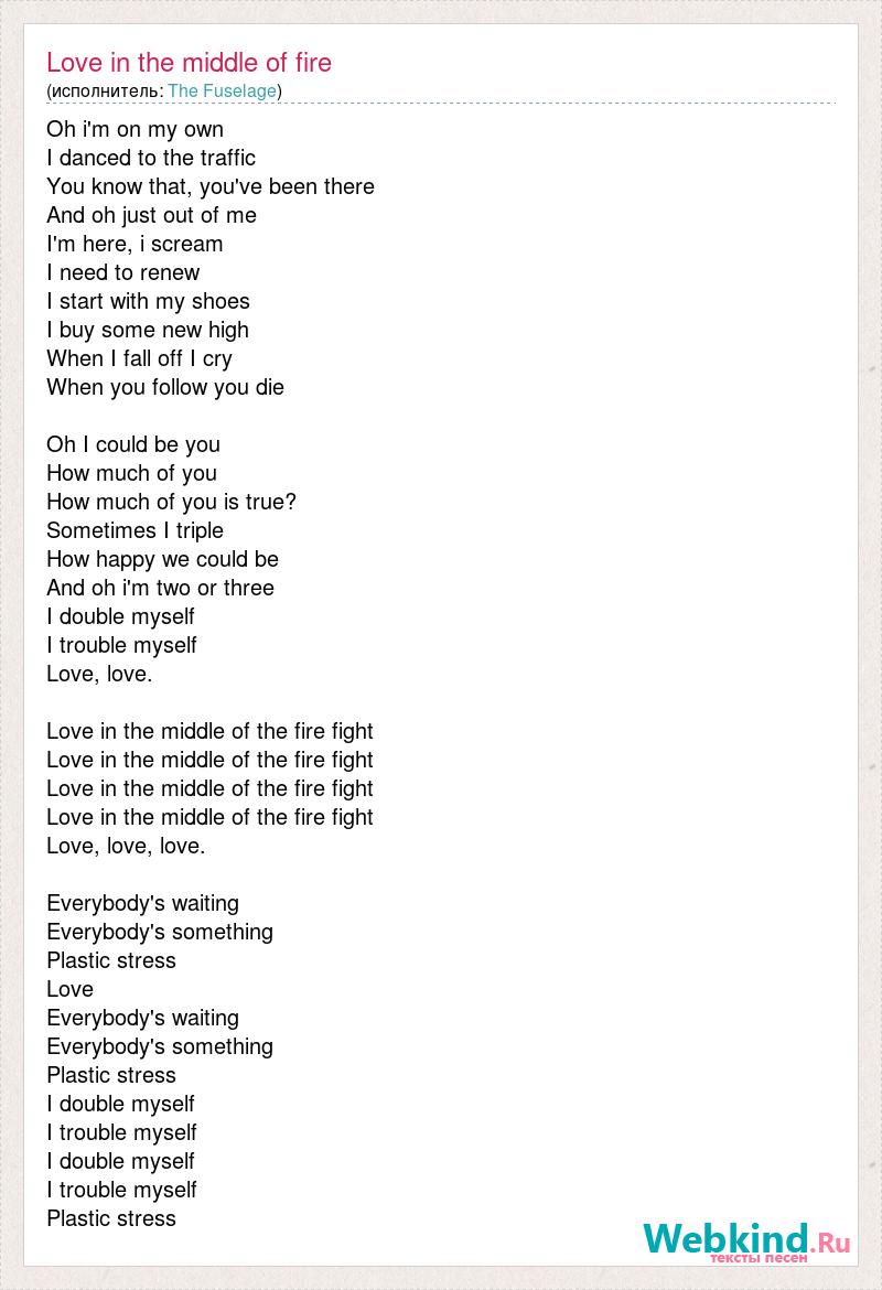 Oh i'm on my own I danced to the traffic You know that, you've been there And oh just out of me I'm here, i scream I need to renew I start with my shoes I buy some new high When I fall off I cry When you follow you die Oh I could be you How much of you How much of you is true? Sometimes I triple How happy we could be And oh i'm two or three I double myself I trouble myself Love, love. Love in the middle of the fire fight Love in the middle of the fire fight Love in the middle of the fire fight Love in the middle of the fire fight Love, love, love. Everybody's waiting Everybody's something Plastic stress Love Everybody's waiting Everybody's something Plastic stress I double myself I trouble myself I double myself I trouble myself Plastic stress
