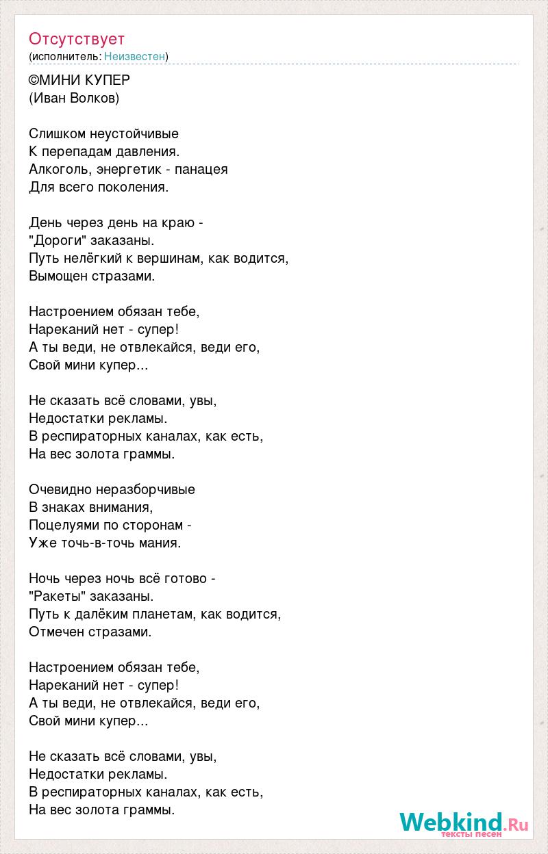 ©МИНИ КУПЕР (Иван Волков) Слишком неустойчивые К перепадам давления. Алкоголь, энергетик - панацея Для всего поколения. День через день на краю - "Дороги" заказаны. Путь нелёгкий к вершинам, как водится, Вымощен стразами. Настроением обязан тебе, Нареканий нет - супер! А ты веди, не отвлекайся, веди его, Свой мини купер... Не сказать всё словами, увы, Недостатки рекламы. В респираторных каналах, как есть, На вес золота граммы. Очевидно неразборчивые В знаках внимания, Поцелуями по сторонам - Уже точь-в-точь мания. Ночь через ночь всё готово - "Ракеты" заказаны. Путь к далёким планетам, как водится, Отмечен стразами. Настроением обязан тебе, Нареканий нет - супер! А ты веди, не отвлекайся, веди его, Свой мини купер... Не сказать всё словами, увы, Недостатки рекламы. В респираторных каналах, как есть, На вес золота граммы.
