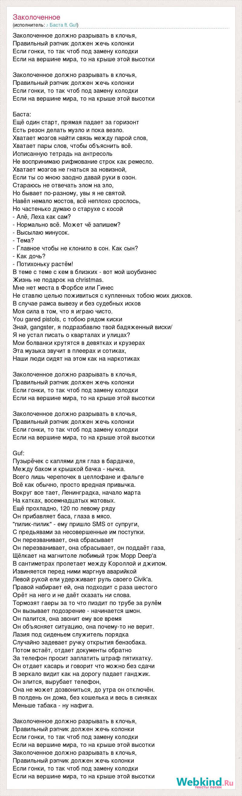 Заколоченное должно разрывать в клочья, Правильный рэпчик должен жечь колонки Если гонки, то так чтоб под замену колодки Если на вершине мира, то на крыше этой высотки Заколоченное должно разрывать в клочья, Правильный рэпчик должен жечь колонки Если гонки, то так чтоб под замену колодки Если на вершине мира, то на крыше этой высотки Баста: Ещё один старт, прямая падает за горизонт Есть резон делать музло и пока везло. Хватает мозгов найти связь между парой слов, Хватает пары слов, чтобы объяснить всё. Исписанную тетрадь на антресоль Не воспринимаю рифмование строк как ремесло. Хватает мозгов не гнаться за новизной, Если ты со мною заодно давай руки в озон. Стараюсь не отвечать злом на зло, Но бывает по-разному, увы я не святой. Навёл немало мостов, всё неплохо срослось, Но частенько думаю о старухе с косой - Алё, Леха как сам? - Нормально всё. Может чё запишем? - Высылаю минусок. - Тема? - Главное чтобы не клонило в сон. Как сын? - Как дочь? - Потихоньку растём! В теме с теме с кем в близких - вот мой шоубизнес Жизнь не подарок на christmas. Мне нет места в Форбсе или Гинес Не ставлю целью поживиться с купленных тобою моих дисков. В случае рамса вывезу и без судебных исков Моя сила в том, что я играю чисто. You gared pistols, с тобою рядом киски Знай, gangster, я подразбавлю твой бадяженный виски/ Я не устал писать о кварталах и улицах? Мои болванки крутятся в девятках и крузерах Эта музыка звучит в плеерах и сотиках, Наши люди сидят на этом как на наркотиках Заколоченное должно разрывать в клочья, Правильный рэпчик должен жечь колонки Если гонки, то так чтоб под замену колодки Если на вершине мира, то на крыше этой высотки Заколоченное должно разрывать в клочья, Правильный рэпчик должен жечь колонки Если гонки, то так чтоб под замену колодки Если на вершине мира, то на крыше этой высотки Guf: Пузырёчек с каплями для глаз в бардачке, Между баком и крышкой бачка - нычка. Всего лишь черепочек в целлофане и фальге Всё как обычно, просто вредная привычка. Вокруг все тает, Ленинградка, начало марта На катках, восемнадцатых матовых. Ещё прохладно, 120 по левому ряду Он прибавляет баса, глаза в мясо. "пилик-пилик" - ему пришло SMS от супруги, С предьявами за несовершенные им поступки. Он перезванивает, она сбрасывает Он перезванивает, она сбрасывает, он поддаёт газа, Щёлкает на магнитоле любимый трэк Mopp Deep'а В сантиметрах пролетает между Короллой и джипом. Извиняется перед ними маргнув аварийкой Левой рукой ели удерживает руль своего Civik'a. Правой набирает ей, она подходит с раза шестого Орёт на него и не даёт сказать ни слова. Тормозят гаеры за то что пиздит по трубе за рулём Он вызывает подозрение - начинается шмон. Он палится, она звонит ему все время Он объясняет ситуацию, она почему-то не верит. Лазия под сиденьем служитель порядка Случайно задевает ручку открытия бензобака. Потом встаёт, отдает документы обратно За телефон просит заплатить штраф пятихатку. Он отдает касарь и говорит что можно без сдачи В зеркало видит как на дорогу падает ганджик. Он злится, вырубает телефон, Она не может дозвониться, до утра он отключён. В полдень он дома, без кошелька и весь в синяках Меньше табака - ну нафига. Заколоченное должно разрывать в клочья, Правильный рэпчик должен жечь колонки Если гонки, то так чтоб под замену колодки Если на вершине мира, то на крыше этой высотки Заколоченное должно разрыва