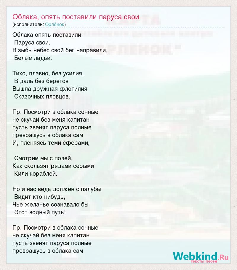 Облака опять поставили Паруса свои. В зыбь небес свой бег направили, Белые ладьи. Тихо, плавно, без усилия, В даль без берегов Вышла дружная флотилия Сказочных пловцов. Пр. Посмотри в облака сонные не скучай без меня капитан пусть звенят паруса полные превращусь в облака сам И, пленяясь теми сферами, Смотрим мы с полей, Как скользят рядами серыми Кили кораблей. Hо и нас ведь должен с палубы Видит кто-нибудь, Чье желанье сознавало бы Этот водный путь! Пр. Посмотри в облака сонные не скучай без меня капитан пусть звенят паруса полные превращусь в облака сам