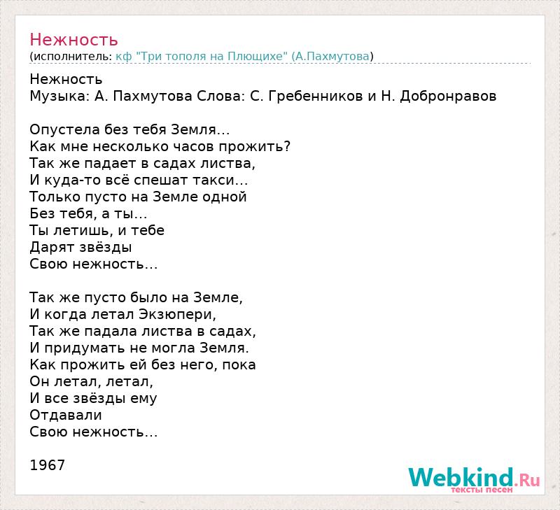 Нежность Музыка: А. Пахмутова Слова: С. Гребенников и Н. Добронравов Опустела без тебя Земля… Как мне несколько часов прожить? Так же падает в садах листва, И куда-то всё спешат такси… Только пусто на Земле одной Без тебя, а ты… Ты летишь, и тебе Дарят звёзды Свою нежность… Так же пусто было на Земле, И когда летал Экзюпери, Так же падала листва в садах, И придумать не могла Земля. Как прожить ей без него, пока Он летал, летал, И все звёзды ему Отдавали Свою нежность… 1967