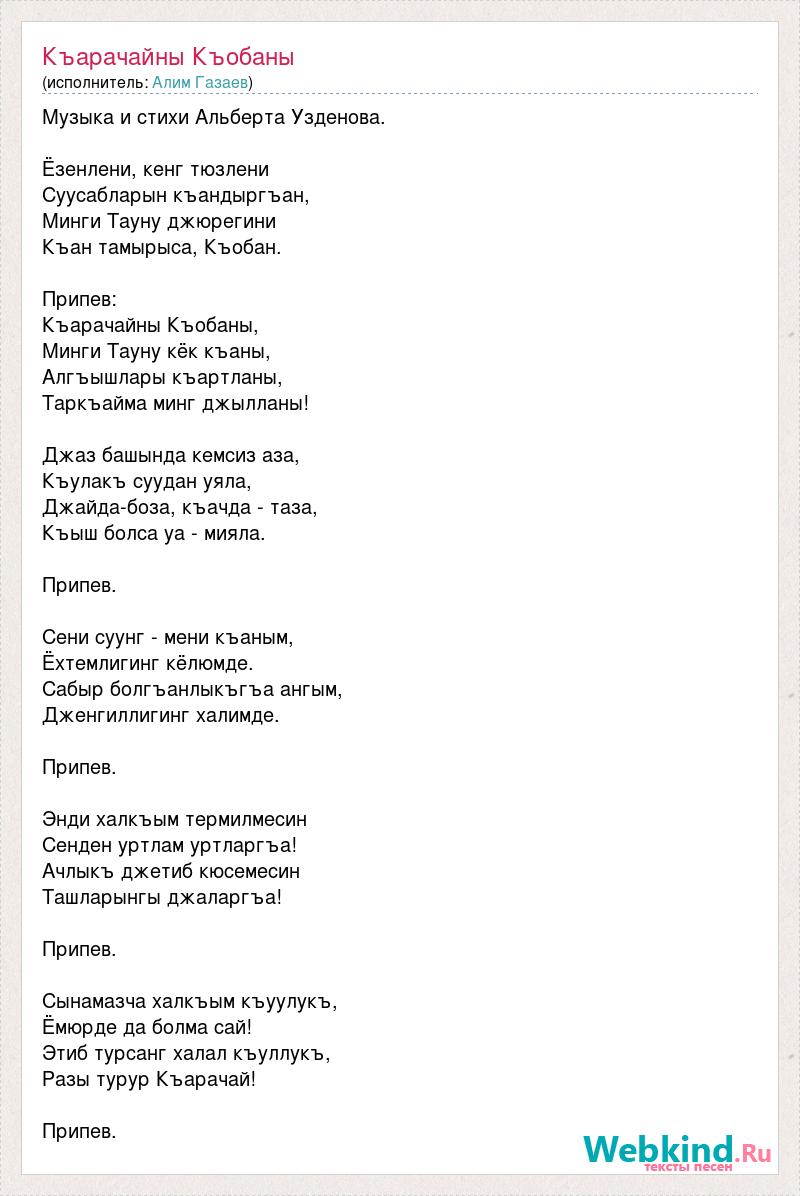 Музыка и стихи Альберта Узденова. Ёзенлени, кенг тюзлени Суусабларын къандыргъан, Минги Тауну джюрегини Къан тамырыса, Къобан. Припев: Къарачайны Къобаны, Минги Тауну кёк къаны, Алгъышлары къартланы, Таркъайма минг джылланы! Джаз башында кемсиз аза, Къулакъ суудан уяла, Джайда-боза, къачда - таза, Къыш болса уа - мияла. Припев. Сени суунг - мени къаным, Ёхтемлигинг кёлюмде. Сабыр болгъанлыкъгъа ангым, Дженгиллигинг халимде. Припев. Энди халкъым термилмесин Сенден уртлам уртларгъа! Ачлыкъ джетиб кюсемесин Ташларынгы джаларгъа! Припев. Сынамазча халкъым къуулукъ, Ёмюрде да болма сай! Этиб турсанг халал къуллукъ, Разы турур Къарачай! Припев.