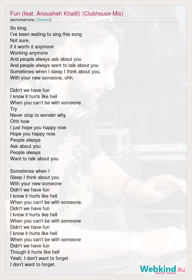 So long, I’ve been waiting to sing this song Not sure, if it worth it anymore Working anymore And people always ask about you And people always want to talk about you Sometimes when I sleep I think about you, With your new someone, ohh. Didn't we have fun I know it hurts like hell When you can't be with someone Try Never stop to wonder why Ohh how I just hope you happy now Hope you happy now. People always Ask about you People always Want to talk about you Sometimes when I Sleep I think about you With your new someone Didn't we have fun I know it hurts like hell When you can't be with someone. Didn't we have fun I know it hurts like hell When you can't be with someone Didn't we have fun I know it hurts like hell When you can't be with someone Didn't we have fun Though it hurts like hell Yeah, I don’t want to forget I don’t want to forget.