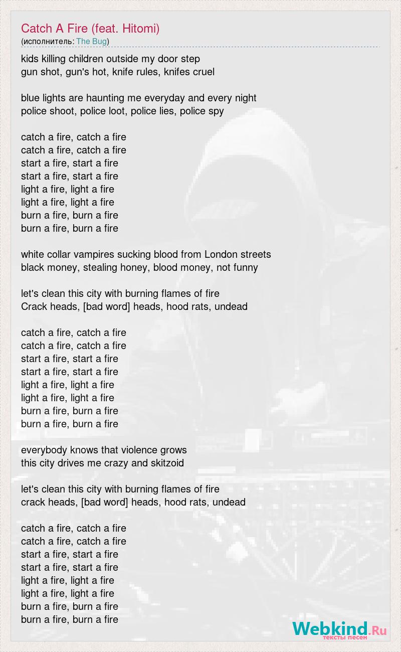 kids killing children outside my door step gun shot, gun's hot, knife rules, knifes cruel blue lights are haunting me everyday and every night police shoot, police loot, police lies, police spy catch a fire, catch a fire catch a fire, catch a fire start a fire, start a fire start a fire, start a fire light a fire, light a fire light a fire, light a fire burn a fire, burn a fire burn a fire, burn a fire white collar vampires sucking blood from London streets black money, stealing honey, blood money, not funny let's clean this city with burning flames of fire Crack heads, [bad word] heads, hood rats, undead catch a fire, catch a fire catch a fire, catch a fire start a fire, start a fire start a fire, start a fire light a fire, light a fire light a fire, light a fire burn a fire, burn a fire burn a fire, burn a fire everybody knows that violence grows this city drives me crazy and skitzoid let's clean this city with burning flames of fire crack heads, [bad word] heads, hood rats, undead catch a fire, catch a fire catch a fire, catch a fire start a fire, start a fire start a fire, start a fire light a fire, light a fire light a fire, light a fire burn a fire, burn a fire burn a fire, burn a fire