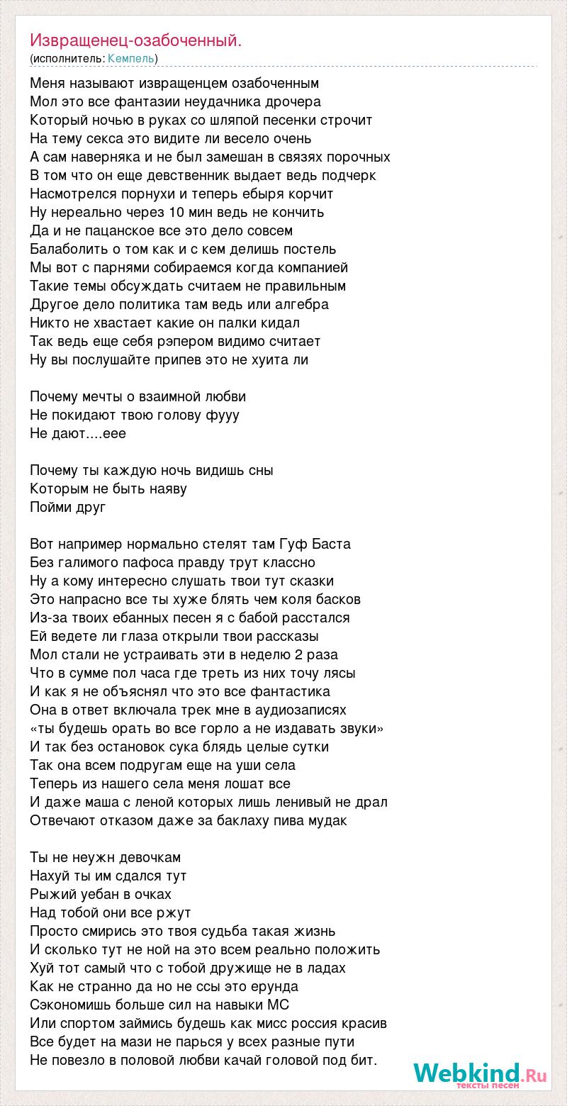 Меня называют извращенцем озабоченным Мол это все фантазии неудачника дрочера Который ночью в руках со шляпой песенки строчит На тему секса это видите ли весело очень А сам наверняка и не был замешан в связях порочных В том что он еще девственник выдает ведь подчерк Насмотрелся порнухи и теперь ебыря корчит Ну нереально через 10 мин ведь не кончить Да и не пацанское все это дело совсем Балаболить о том как и с кем делишь постель Мы вот с парнями собираемся когда компанией Такие темы обсуждать считаем не правильным Другое дело политика там ведь или алгебра Никто не хвастает какие он палки кидал Так ведь еще себя рэпером видимо считает Ну вы послушайте припев это не хуита ли Почему мечты о взаимной любви Не покидают твою голову фууу Не дают....еее Почему ты каждую ночь видишь сны Которым не быть наяву Пойми друг Вот например нормально стелят там Гуф Баста Без галимого пафоса правду трут классно Ну а кому интересно слушать твои тут сказки Это напрасно все ты хуже блять чем коля басков Из-за твоих ебанных песен я с бабой расстался Ей ведете ли глаза открыли твои рассказы Мол стали не устраивать эти в неделю 2 раза Что в сумме пол часа где треть из них точу лясы И как я не объяснял что это все фантастика Она в ответ включала трек мне в аудиозаписях «ты будешь орать во все горло а не издавать звуки» И так без остановок сука блядь целые сутки Так она всем подругам еще на уши села Теперь из нашего села меня лошат все И даже маша с леной которых лишь ленивый не драл Отвечают отказом даже за баклаху пива мудак Ты не неужн девочкам Нахуй ты им сдался тут Рыжий уебан в очках Над тобой они все ржут Просто смирись это твоя судьба такая жизнь И сколько тут не ной на это всем реально положить Хуй тот самый что с тобой дружище не в ладах Как не странно да но не ссы это ерунда Сэкономишь больше сил на навыки МС Или спортом займись будешь как мисс россия красив Все будет на мази не парься у всех разные пути Не повезло в половой любви качай головой под бит.