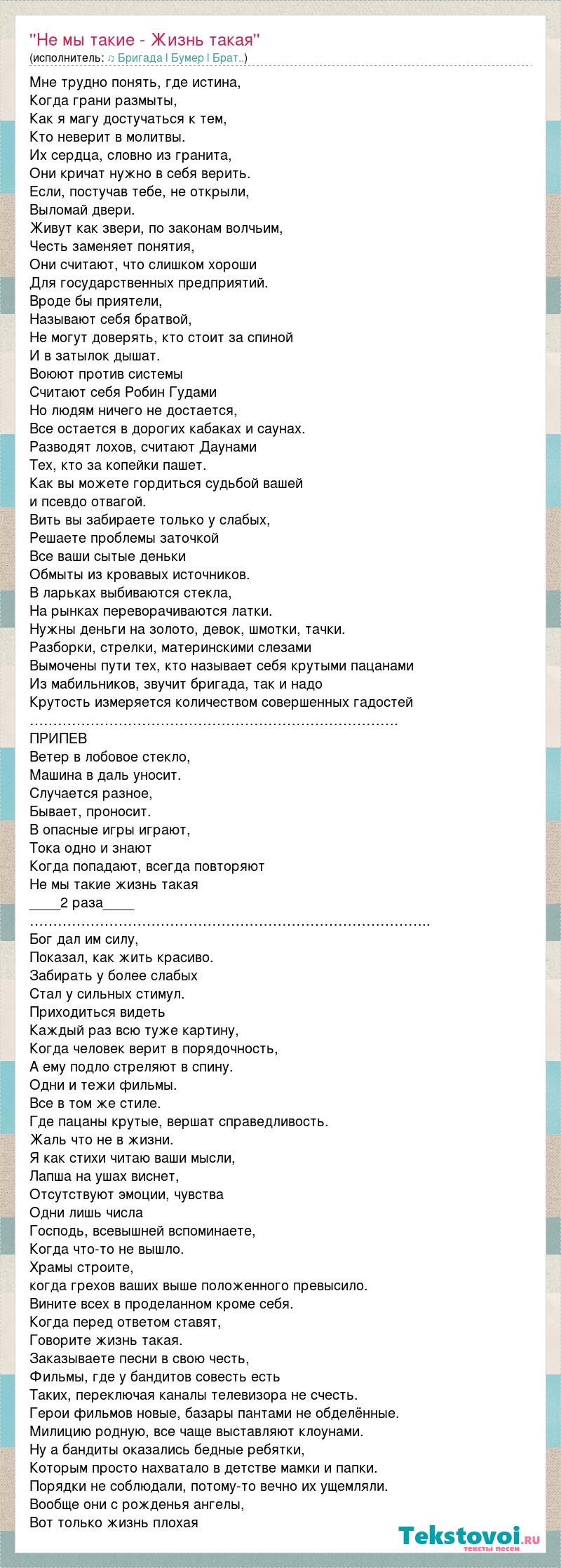 Мне трудно понять, где истина, Когда грани размыты, Как я магу достучаться к тем, Кто неверит в молитвы. Их сердца, словно из гранита, Они кричат нужно в себя верить. Если, постучав тебе, не открыли, Выломай двери. Живут как звери, по законам волчьим, Честь заменяет понятия, Они считают, что слишком хороши Для государственных предприятий. Вроде бы приятели, Называют себя братвой, Не могут доверять, кто стоит за спиной И в затылок дышат. Воюют против системы Считают себя Робин Гудами Но людям ничего не достается, Все остается в дорогих кабаках и саунах. Разводят лохов, считают Даунами Тех, кто за копейки пашет. Как вы можете гордиться судьбой вашей и псевдо отвагой. Вить вы забираете только у слабых, Решаете проблемы заточкой Все ваши сытые деньки Обмыты из кровавых источников. В ларьках выбиваются стекла, На рынках переворачиваются латки. Нужны деньги на золото, девок, шмотки, тачки. Разборки, стрелки, материнскими слезами Вымочены пути тех, кто называет себя крутыми пацанами Из мабильников, звучит бригада, так и надо Крутость измеряется количеством совершенных гадостей ……………………………………………………………………. ПРИПЕВ Ветер в лобовое стекло, Машина в даль уносит. Случается разное, Бывает, проносит. В опасные игры играют, Тока одно и знают Когда попадают, всегда повторяют Не мы такие жизнь такая ____2 раза____ ………………………………………………………………………….. Бог дал им силу, Показал, как жить красиво. Забирать у более слабых Стал у сильных стимул. Приходиться видеть Каждый раз всю туже картину, Когда человек верит в порядочность, А ему подло стреляют в спину. Одни и тежи фильмы. Все в том же стиле. Где пацаны крутые, вершат справедливость. Жаль что не в жизни. Я как стихи читаю ваши мысли, Лапша на ушах виснет, Отсутствуют эмоции, чувства Одни лишь числа Господь, всевышней вспоминаете, Когда что-то не вышло. Храмы строите, когда грехов ваших выше положенного превысило. Вините всех в проделанном кроме себя. Когда перед ответом ставят, Говорите жизнь такая. Заказываете песни в свою честь, Фильмы, где у бандитов совесть есть Таких, переключая каналы телевизора не счесть. Герои фильмов новые, базары пантами не обделённые. Милицию родную, все чаще выставляют клоунами. Ну а бандиты оказались бедные ребятки, Которым просто нахватало в детстве мамки и папки. Порядки не соблюдали, потому-то вечно их ущемляли. Вообще они с рожденья ангелы, Вот только жизнь плохая