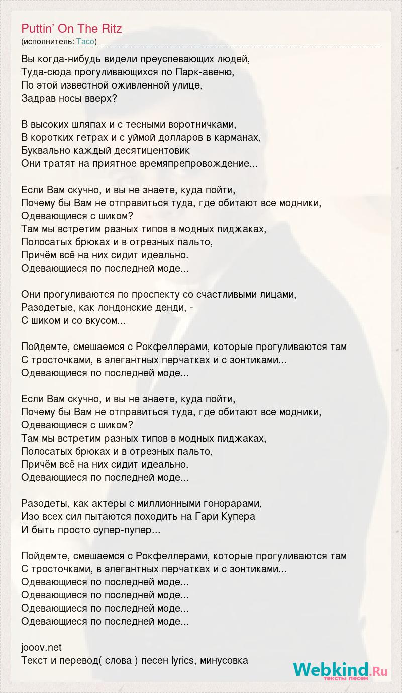 Вы когда-нибудь видели преуспевающих людей, Туда-сюда прогуливающихся по Парк-авеню, По этой известной оживленной улице, Задрав носы вверх? В высоких шляпах и с тесными воротничками, В коротких гетрах и с уймой долларов в карманах, Буквально каждый десятицентовик Они тратят на приятное времяпрепровождение... Если Вам скучно, и вы не знаете, куда пойти, Почему бы Вам не отправиться туда, где обитают все модники, Одевающиеся с шиком? Там мы встретим разных типов в модных пиджаках, Полосатых брюках и в отрезных пальто, Причём всё на них сидит идеально. Одевающиеся по последней моде... Они прогуливаются по проспекту со счастливыми лицами, Разодетые, как лондонские денди, - С шиком и со вкусом... Пойдемте, смешаемся с Рокфеллерами, которые прогуливаются там С тросточками, в элегантных перчатках и с зонтиками... Одевающиеся по последней моде... Если Вам скучно, и вы не знаете, куда пойти, Почему бы Вам не отправиться туда, где обитают все модники, Одевающиеся с шиком? Там мы встретим разных типов в модных пиджаках, Полосатых брюках и в отрезных пальто, Причём всё на них сидит идеально. Одевающиеся по последней моде... Разодеты, как актеры с миллионными гонорарами, Изо всех сил пытаются походить на Гари Купера И быть просто супер-пупер... Пойдемте, смешаемся с Рокфеллерами, которые прогуливаются там С тросточками, в элегантных перчатках и с зонтиками... Одевающиеся по последней моде... Одевающиеся по последней моде... Одевающиеся по последней моде... Одевающиеся по последней моде... jooov.net Текст и перевод( слова ) песен lyrics, минусовка
