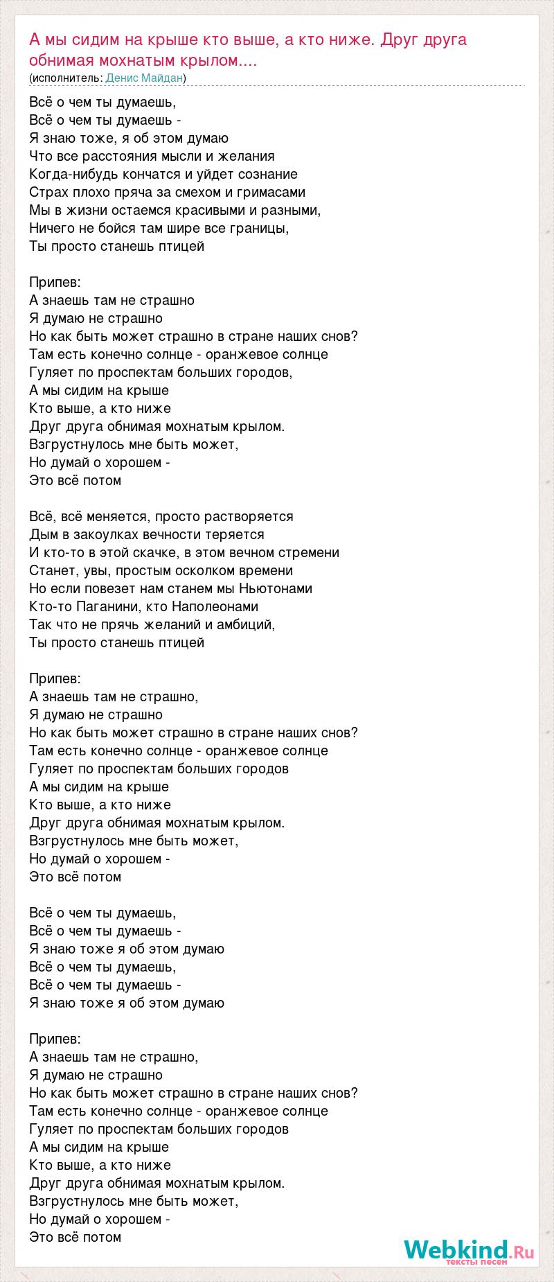 Всё о чем ты думаешь, Всё о чем ты думаешь - Я знаю тоже, я об этом думаю Что все расстояния мысли и желания Когда-нибудь кончатся и уйдет сознание Страх плохо пряча за смехом и гримасами Мы в жизни остаемся красивыми и разными, Ничего не бойся там шире все границы, Ты просто станешь птицей Припев: А знаешь там не страшно Я думаю не страшно Но как быть может страшно в стране наших снов? Там есть конечно солнце - оранжевое солнце Гуляет по проспектам больших городов, А мы сидим на крыше Кто выше, а кто ниже Друг друга обнимая мохнатым крылом. Взгрустнулось мне быть может, Но думай о хорошем - Это всё потом Всё, всё меняется, просто растворяется Дым в закоулках вечности теряется И кто-то в этой скачке, в этом вечном стремени Станет, увы, простым осколком времени Но если повезет нам станем мы Ньютонами Кто-то Паганини, кто Наполеонами Так что не прячь желаний и амбиций, Ты просто станешь птицей Припев: А знаешь там не страшно, Я думаю не страшно Но как быть может страшно в стране наших снов? Там есть конечно солнце - оранжевое солнце Гуляет по проспектам больших городов А мы сидим на крыше Кто выше, а кто ниже Друг друга обнимая мохнатым крылом. Взгрустнулось мне быть может, Но думай о хорошем - Это всё потом Всё о чем ты думаешь, Всё о чем ты думаешь - Я знаю тоже я об этом думаю Всё о чем ты думаешь, Всё о чем ты думаешь - Я знаю тоже я об этом думаю Припев: А знаешь там не страшно, Я думаю не страшно Но как быть может страшно в стране наших снов? Там есть конечно солнце - оранжевое солнце Гуляет по проспектам больших городов А мы сидим на крыше Кто выше, а кто ниже Друг друга обнимая мохнатым крылом. Взгрустнулось мне быть может, Но думай о хорошем - Это всё потом