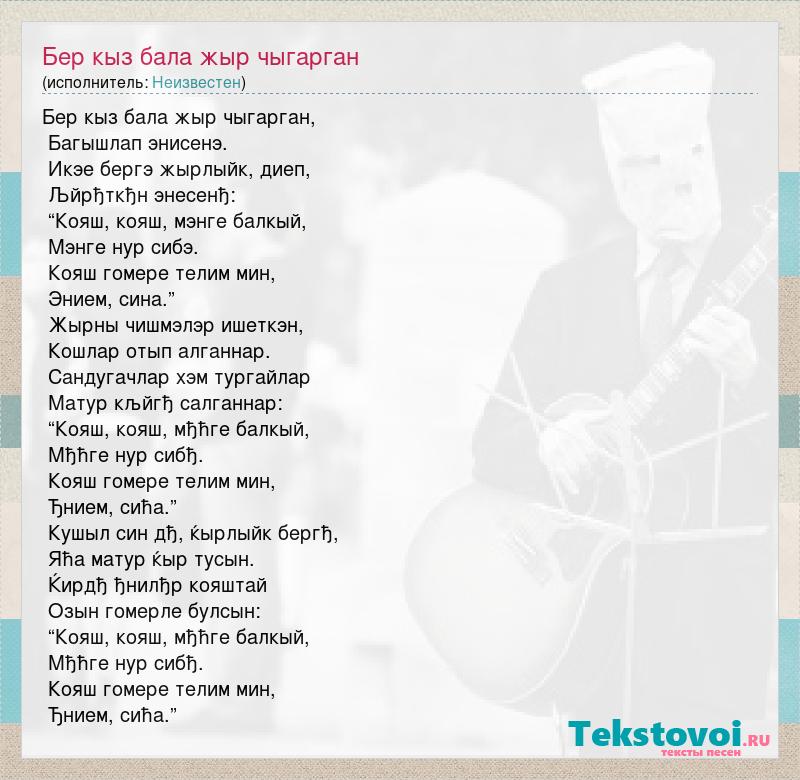 Бер кыз бала жыр чыгарган, Багышлап энисенэ. Икэe бергэ жырлыйк, диеп, Љйрђткђн энесенђ: “Кояш, кояш, мэнге балкый, Мэнге нур сибэ. Кояш гомере телим мин, Энием, сина.” Жырны чишмэлэр ишеткэн, Кошлар отып алганнар. Сандугачлар хэм тургайлар Матур кљйгђ салганнар: “Кояш, кояш, мђћге балкый, Мђћге нур сибђ. Кояш гомере телим мин, Ђнием, сића.” Кушыл син дђ, ќырлыйк бергђ, Яћа матур ќыр тусын. Ќирдђ ђнилђр кояштай Озын гомерле булсын: “Кояш, кояш, мђћге балкый, Мђћге нур сибђ. Кояш гомере телим мин, Ђнием, сића.”