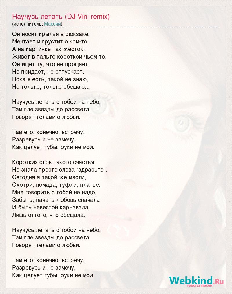 Он носит крылья в рюкзаке, Мечтает и грустит о ком-то, А на картинке так жесток. Живет в пальто коротком чьем-то. Он ищет ту, что не прощает, Не придает, не отпускает. Пока я есть, такой не знаю, Но только, только обещаю... Научусь летать с тобой на небо, Там где звезды до рассвета Говорят телами о любви. Там его, конечно, встречу, Разревусь и не замечу, Как целует губы, руки не мои. Коротких слов такого счастья Не знала просто слова "здрасьте". Сегодня я такой же масти, Смотри, помада, туфли, платье. Мне говорить с тобой не надо, Забыть, начать любовь сначала И быть невестой карнавала, Лишь оттого, что обещала. Научусь летать с тобой на небо, Там где звезды до рассвета Говорят телами о любви. Там его, конечно, встречу, Разревусь и не замечу, Как целует губы, руки не мои