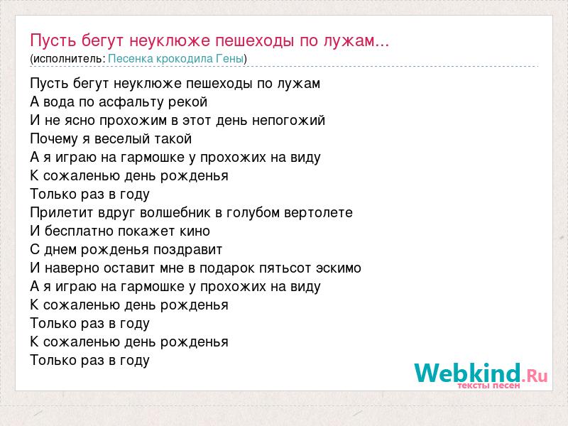 Пусть бегут неуклюже пешеходы по лужам А вода по асфальту рекой И не ясно прохожим в этот день непогожий Почему я веселый такой А я играю на гармошке у прохожих на виду К сожаленью день рожденья Только раз в году Прилетит вдруг волшебник в голубом вертолете И бесплатно покажет кино С днем рожденья поздравит И наверно оставит мне в подарок пятьсот эскимо А я играю на гармошке у прохожих на виду К сожаленью день рожденья Только раз в году К сожаленью день рожденья Только раз в году