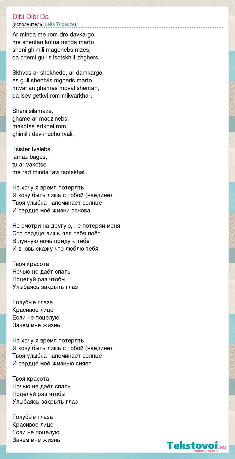 Ar minda me rom dro davkargo, me shentan kofna minda marto, sheni ghimili magonebs mzes, da chemi guli sitsotskhlit zhghers. Skhvas ar shekhedo, ar damkargo, es guli shentvis mgheris marto, mtvarian ghames moval shentan, da isev getkvi rom mikvarkhar. Sheni silamaze, ghame ar madzinebs, makotse ertkhel rom, ghimilit davkhucho tvali. Tsisfer tvalebs, lamaz bages, tu ar vakotse me rad minda tavi tsotskhali. Не хочу я время потерять Я хочу быть лишь с тобой (наедине) Твоя улыбка напоминает солнце И сердце моё жизни основа Не смотри на другую, не потеряй меня Это сердце лишь для тебя поёт В лунную ночь приду к тебе И вновь скажу что люблю тебя Твоя красота Ночью не даёт спать Поцелуй раз чтобы Улыбаясь закрыть глаз Голубые глаза Красивое лицо Если не поцелую Зачем мне жизнь Не хочу я время потерять Я хочу быть лишь с тобой (наедине) Твоя улыбка напоминает солнце И сердце моё жизнью сияет Твоя красота Ночью не даёт спать Поцелуй раз чтобы Улыбаясь закрыть глаз Голубые глаза Красивое лицо Если не поцелую Зачем мне жизнь
