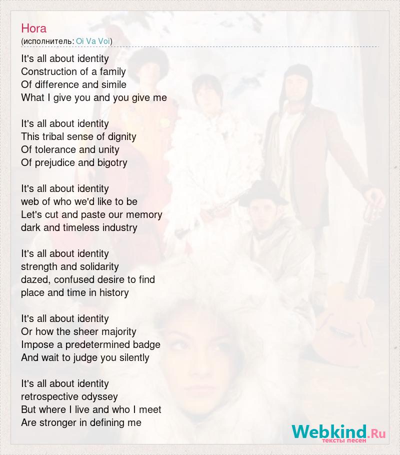 It's all about identity Construction of a family Of difference and simile What I give you and you give me It's all about identity This tribal sense of dignity Of tolerance and unity Of prejudice and bigotry It's all about identity web of who we'd like to be Let's cut and paste our memory dark and timeless industry It's all about identity strength and solidarity dazed, confused desire to find place and time in history It's all about identity Or how the sheer majority Impose a predetermined badge And wait to judge you silently It's all about identity retrospective odyssey But where I live and who I meet Are stronger in defining me