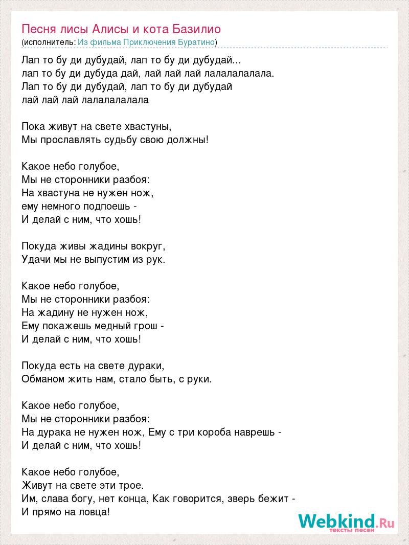 Лап то бу ди дубудай, лап то бу ди дубудай... лап то бу ди дубуда дай, лай лай лай лалалалалала. Лап то бу ди дубудай, лап то бу ди дубудай лай лай лай лалалалалала Пока живут на свете хвастуны, Мы прославлять судьбу свою должны! Какое небо голубое, Мы не сторонники разбоя: На хвастуна не нужен нож, ему немного подпоешь - И делай с ним, что хошь! Покуда живы жадины вокруг, Удачи мы не выпустим из рук. Какое небо голубое, Мы не сторонники разбоя: На жадину не нужен нож, Ему покажешь медный грош - И делай с ним, что хошь! Покуда есть на свете дураки, Обманом жить нам, стало быть, с руки. Какое небо голубое, Мы не сторонники разбоя: На дурака не нужен нож, Ему с три короба наврешь - И делай с ним, что хошь! Какое небо голубое, Живут на свете эти трое. Им, слава богу, нет конца, Как говорится, зверь бежит - И прямо на ловца!
