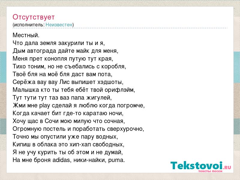 Местный. Что дала земля закурили ты и я, Дым автограда дайте майк для меня, Меня прет конопля путую тут края, Тихо тоним, но не съебались с коробля, Твоё бля на моё бля даст вам пота, Серёжа вау вау Лис выпишет хэдшоты, Малышка кто ты тебя ебёт твой орифлэйм, Тут тути тут таз ваз папа жигулей, Жми мне play сделай я люблю когда погромче, Когда качает бит где-то каратаю ночи, Хочу щас в Сочи мою милую что сочная, Огромную постель и поработать сверхурочно, Точно мы опустили уже пару водных, Кипиш в облака это хип-хап свободных, Я не учу курить ты об этом и не думай, На мне броня adidas, ники-найки, puma.