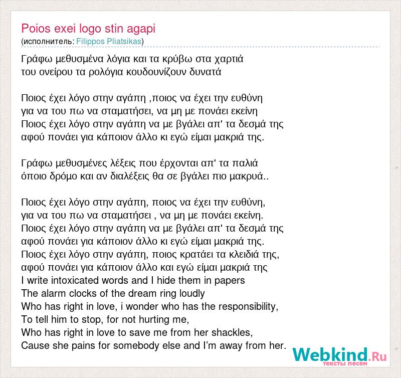 Γράφω μεθυσμένα λόγια και τα κρύβω στα χαρτιά του ονείρου τα ρολόγια κουδουνίζουν δυνατά Ποιος έχει λόγο στην αγάπη ,ποιος να έχει την ευθύνη για να του πω να σταματήσει, να μη με πονάει εκείνη Ποιος έχει λόγο στην αγάπη να με βγάλει απ' τα δεσμά της αφού πονάει για κάποιον άλλο κι εγώ είμαι μακριά της. Γράφω μεθυσμένες λέξεις που έρχονται απ' τα παλιά όποιο δρόμο και αν διαλέξεις θα σε βγάλει πιο μακρυά.. Ποιος έχει λόγο στην αγάπη, ποιος να έχει την ευθύνη, για να του πω να σταματήσει , να μη με πονάει εκείνη. Ποιος έχει λόγο στην αγάπη να με βγάλει απ' τα δεσμά της αφού πονάει για κάποιον άλλο κι εγώ είμαι μακριά της. Ποιος έχει λόγο στην αγάπη, ποιος κρατάει τα κλειδιά της, αφού πονάει για κάποιον άλλο και εγώ είμαι μακριά της I write intoxicated words and I hide them in papers The alarm clocks of the dream ring loudly Who has right in love, i wonder who has the responsibility, To tell him to stop, for not hurting me, Who has right in love to save me from her shackles, Cause she pains for somebody else and I’m away from her.