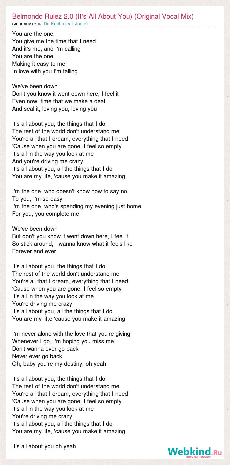 You are the one, You give me the time that I need And it's me, and I'm calling You are the one, Making it easy to me In love with you I'm falling We've been down Don't you know it went down here, I feel it Even now, time that we make a deal And seal it, loving you, loving you It's all about you, the things that I do The rest of the world don't understand me You're all that I dream, everything that I need ‘Cause when you are gone, I feel so empty It's all in the way you look at me And you're driving me crazy It's all about you, all the things that I do You are my life, 'cause you make it amazing I'm the one, who doesn't know how to say no To you, I'm so easy I'm the one, who's spending my evening just home For you, you complete me We've been down But don't you know it went down here, I feel it So stick around, I wanna know what it feels like Forever and ever It's all about you, the things that I do The rest of the world don't understand me You're all that I dream, everything that I need ‘Cause when you are gone, I feel so empty It's all in the way you look at me You're driving me crazy It's all about you, all the things that I do You are my lif,e 'cause you make it amazing I'm never alone with the love that you're giving Whenever I go, I'm hoping you miss me Don't wanna ever go back Never ever go back Oh, baby you're my destiny, oh yeah It's all about you, the things that I do The rest of the world don't understand me You're all that I dream, everything that I need ‘Cause when you are gone, I feel so empty It's all in the way you look at me You're driving me crazy It's all about you, all the things that I do You are my life, 'cause you make it amazing It's all about you oh yeah