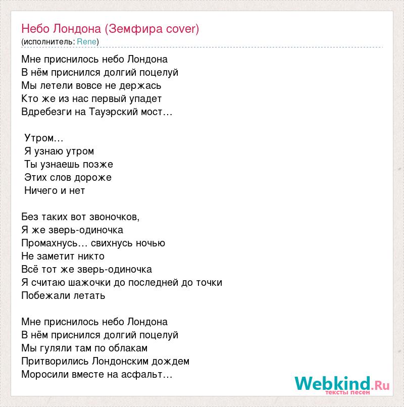 Мне приснилось небо Лондона В нём приснился долгий поцелуй Мы летели вовсе не держась Кто же из нас первый упадет Вдребезги на Тауэрский мост… Утром… Я узнаю утром Ты узнаешь позже Этих слов дороже Ничего и нет Без таких вот звоночков, Я же зверь-одиночка Промахнусь… свихнусь ночью Не заметит никто Всё тот же зверь-одиночка Я считаю шажочки до последней до точки Побежали летать Мне приснилось небо Лондона В нём приснился долгий поцелуй Мы гуляли там по облакам Притворились Лондонским дождем Моросили вместе на асфальт…