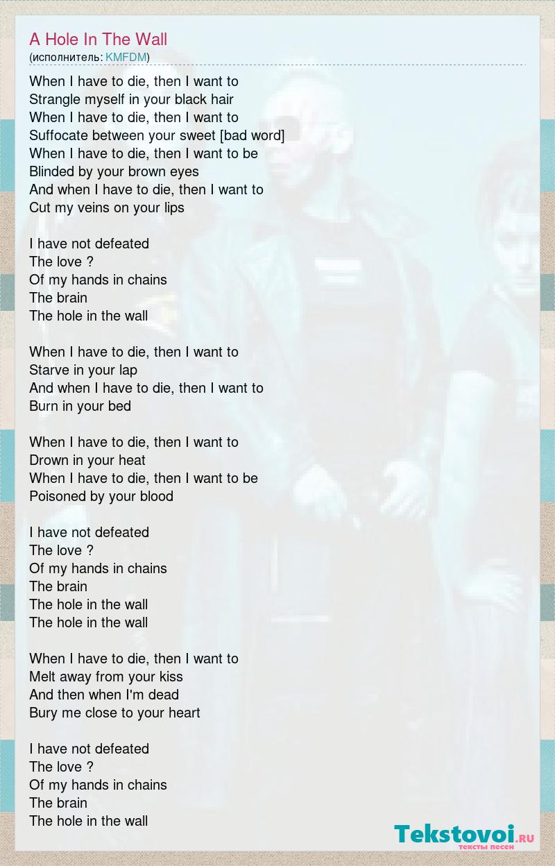 When I have to die, then I want to Strangle myself in your black hair When I have to die, then I want to Suffocate between your sweet [bad word] When I have to die, then I want to be Blinded by your brown eyes And when I have to die, then I want to Cut my veins on your lips I have not defeated The love ? Of my hands in chains The brain The hole in the wall When I have to die, then I want to Starve in your lap And when I have to die, then I want to Burn in your bed When I have to die, then I want to Drown in your heat When I have to die, then I want to be Poisoned by your blood I have not defeated The love ? Of my hands in chains The brain The hole in the wall The hole in the wall When I have to die, then I want to Melt away from your kiss And then when I'm dead Bury me close to your heart I have not defeated The love ? Of my hands in chains The brain The hole in the wall