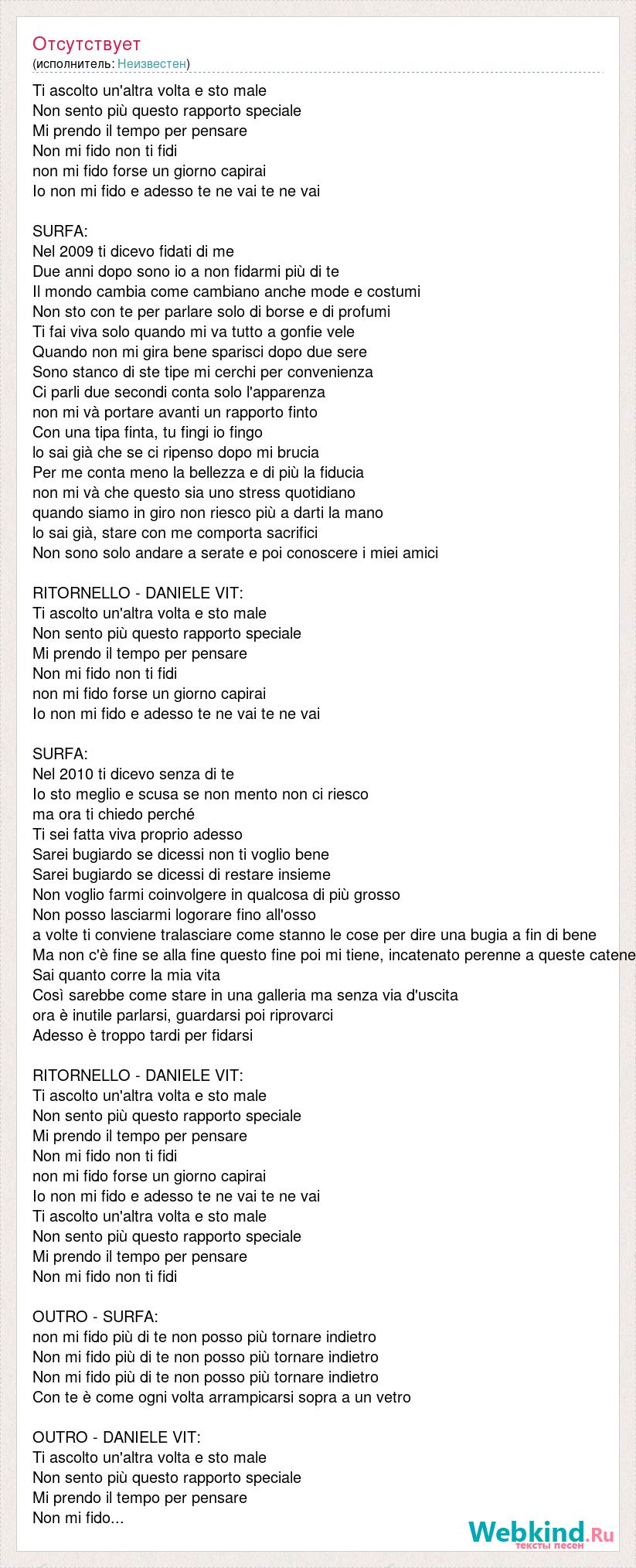 Ti ascolto un'altra volta e sto male Non sento più questo rapporto speciale Mi prendo il tempo per pensare Non mi fido non ti fidi non mi fido forse un giorno capirai Io non mi fido e adesso te ne vai te ne vai SURFA: Nel 2009 ti dicevo fidati di me Due anni dopo sono io a non fidarmi più di te Il mondo cambia come cambiano anche mode e costumi Non sto con te per parlare solo di borse e di profumi Ti fai viva solo quando mi va tutto a gonfie vele Quando non mi gira bene sparisci dopo due sere Sono stanco di ste tipe mi cerchi per convenienza Ci parli due secondi conta solo l'apparenza non mi và portare avanti un rapporto finto Con una tipa finta, tu fingi io fingo lo sai già che se ci ripenso dopo mi brucia Per me conta meno la bellezza e di più la fiducia non mi và che questo sia uno stress quotidiano quando siamo in giro non riesco più a darti la mano lo sai già, stare con me comporta sacrifici Non sono solo andare a serate e poi conoscere i miei amici RITORNELLO - DANIELE VIT: Ti ascolto un'altra volta e sto male Non sento più questo rapporto speciale Mi prendo il tempo per pensare Non mi fido non ti fidi non mi fido forse un giorno capirai Io non mi fido e adesso te ne vai te ne vai SURFA: Nel 2010 ti dicevo senza di te Io sto meglio e scusa se non mento non ci riesco ma ora ti chiedo perché Ti sei fatta viva proprio adesso Sarei bugiardo se dicessi non ti voglio bene Sarei bugiardo se dicessi di restare insieme Non voglio farmi coinvolgere in qualcosa di più grosso Non posso lasciarmi logorare fino all'osso a volte ti conviene tralasciare come stanno le cose per dire una bugia a fin di bene Ma non c'è fine se alla fine questo fine poi mi tiene, incatenato perenne a queste catene Sai quanto corre la mia vita Così sarebbe come stare in una galleria ma senza via d'uscita ora è inutile parlarsi, guardarsi poi riprovarci Adesso è troppo tardi per fidarsi RITORNELLO - DANIELE VIT: Ti ascolto un'altra volta e sto male Non sento più questo rapporto speciale Mi prendo il tempo per pensare Non mi fido non ti fidi non mi fido forse un giorno capirai Io non mi fido e adesso te ne vai te ne vai Ti ascolto un'altra volta e sto male Non sento più questo rapporto speciale Mi prendo il tempo per pensare Non mi fido non ti fidi OUTRO - SURFA: non mi fido più di te non posso più tornare indietro Non mi fido più di te non posso più tornare indietro Non mi fido più di te non posso più tornare indietro Con te è come ogni volta arrampicarsi sopra a un vetro OUTRO - DANIELE VIT: Ti ascolto un'altra volta e sto male Non sento più questo rapporto speciale Mi prendo il tempo per pensare Non mi fido...