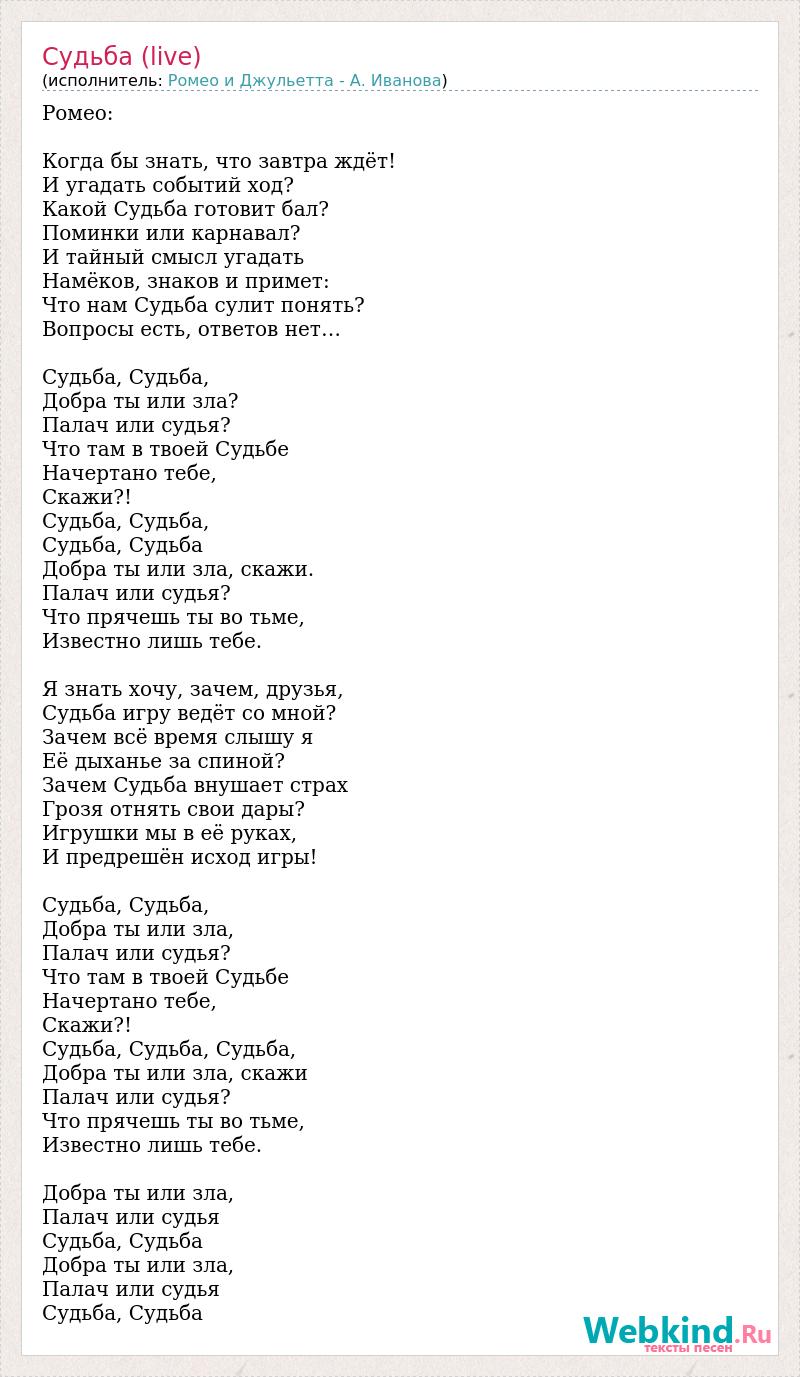 Ромео: Когда бы знать, что завтра ждёт! И угадать событий ход? Какой Судьба готовит бал? Поминки или карнавал? И тайный смысл угадать Намёков, знаков и примет: Что нам Судьба сулит понять? Вопросы есть, ответов нет… Судьба, Судьба, Добра ты или зла? Палач или судья? Что там в твоей Судьбе Начертано тебе, Скажи?! Судьба, Судьба, Судьба, Судьба Добра ты или зла, скажи. Палач или судья? Что прячешь ты во тьме, Известно лишь тебе. Я знать хочу, зачем, друзья, Судьба игру ведёт со мной? Зачем всё время слышу я Её дыханье за спиной? Зачем Судьба внушает страх Грозя отнять свои дары? Игрушки мы в её руках, И предрешён исход игры! Судьба, Судьба, Добра ты или зла, Палач или судья? Что там в твоей Судьбе Начертано тебе, Скажи?! Судьба, Судьба, Судьба, Добра ты или зла, скажи Палач или судья? Что прячешь ты во тьме, Известно лишь тебе. Добра ты или зла, Палач или судья Судьба, Судьба Добра ты или зла, Палач или судья Судьба, Судьба