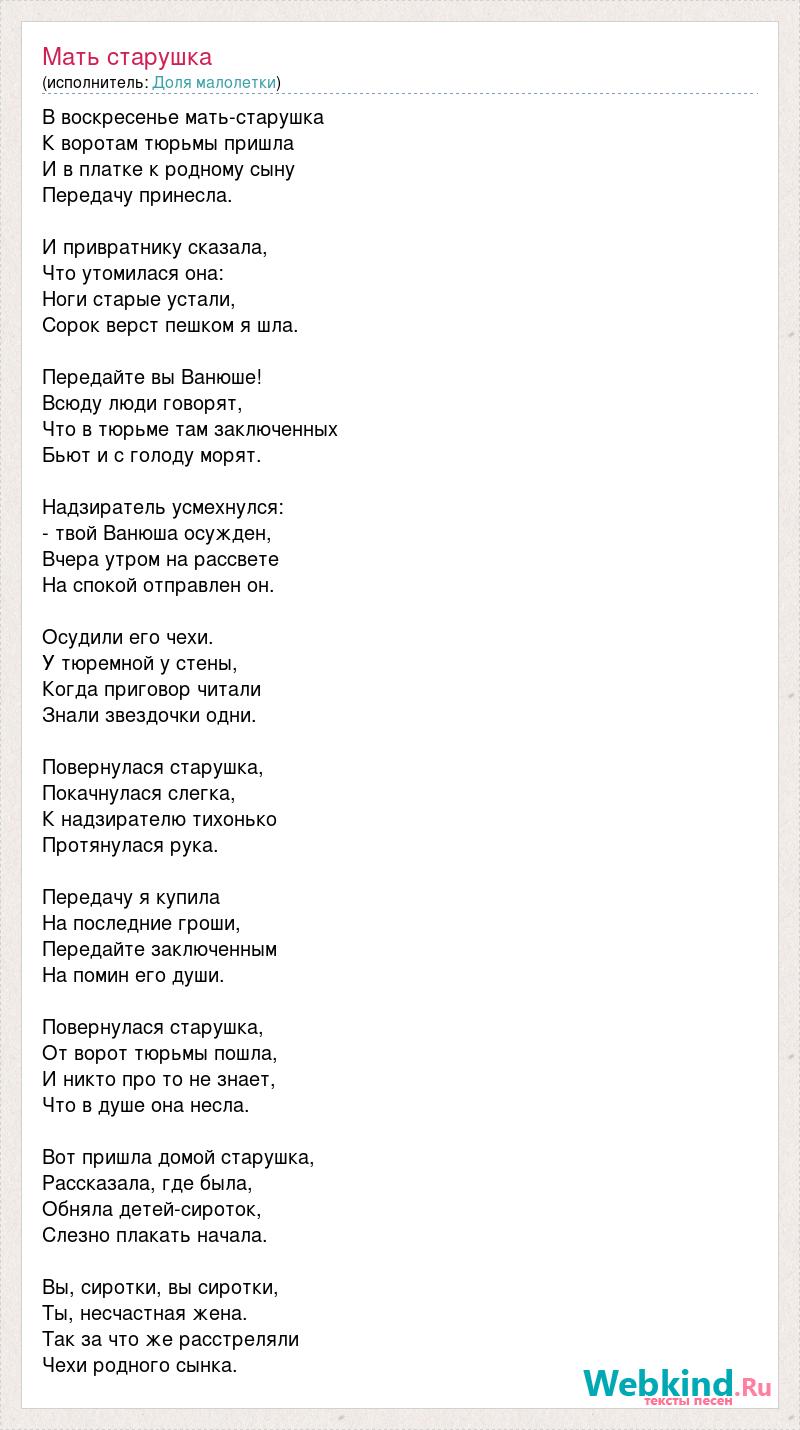 В воскресенье мать-старушка К воротам тюрьмы пришла И в платке к родному сыну Передачу принесла. И привратнику сказала, Что утомилася она: Ноги старые устали, Сорок верст пешком я шла. Передайте вы Ванюше! Всюду люди говорят, Что в тюрьме там заключенных Бьют и с голоду морят. Надзиратель усмехнулся: - твой Ванюша осужден, Вчера утром на рассвете На спокой отправлен он. Осудили его чехи. У тюремной у стены, Когда приговор читали Знали звездочки одни. Повернулася старушка, Покачнулася слегка, К надзирателю тихонько Протянулася рука. Передачу я купила На последние гроши, Передайте заключенным На помин его души. Повернулася старушка, От ворот тюрьмы пошла, И никто про то не знает, Что в душе она несла. Вот пришла домой старушка, Рассказала, где была, Обняла детей-сироток, Слезно плакать начала. Вы, сиротки, вы сиротки, Ты, несчастная жена. Так за что же расстреляли Чехи родного сынка.