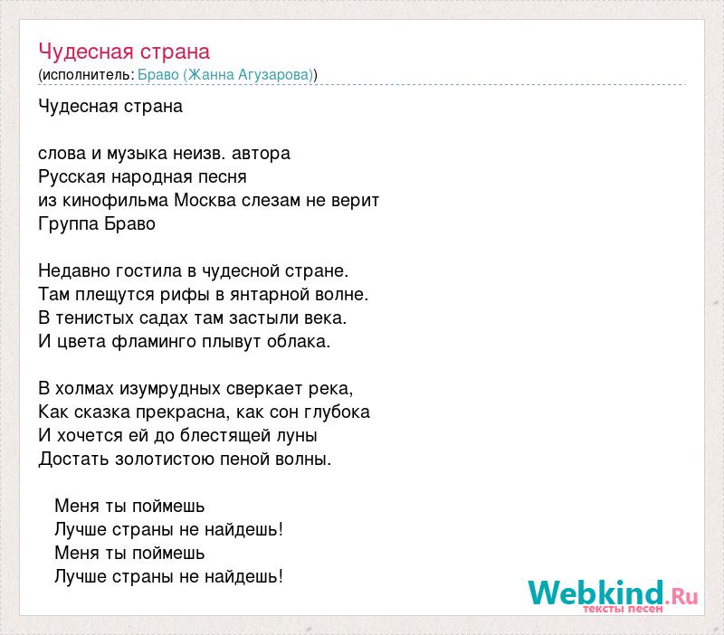Чудесная страна слова и музыка неизв. автора Русская народная песня из кинофильма Москва слезам не верит Группа Браво Недавно гостила в чудесной стране. Там плещутся рифы в янтарной волне. В тенистых садах там застыли века. И цвета фламинго плывут облака. В холмах изумрудных сверкает река, Как сказка прекрасна, как сон глубока И хочется ей до блестящей луны Достать золотистою пеной волны. Меня ты поймешь Лучше страны не найдешь! Меня ты поймешь Лучше страны не найдешь!