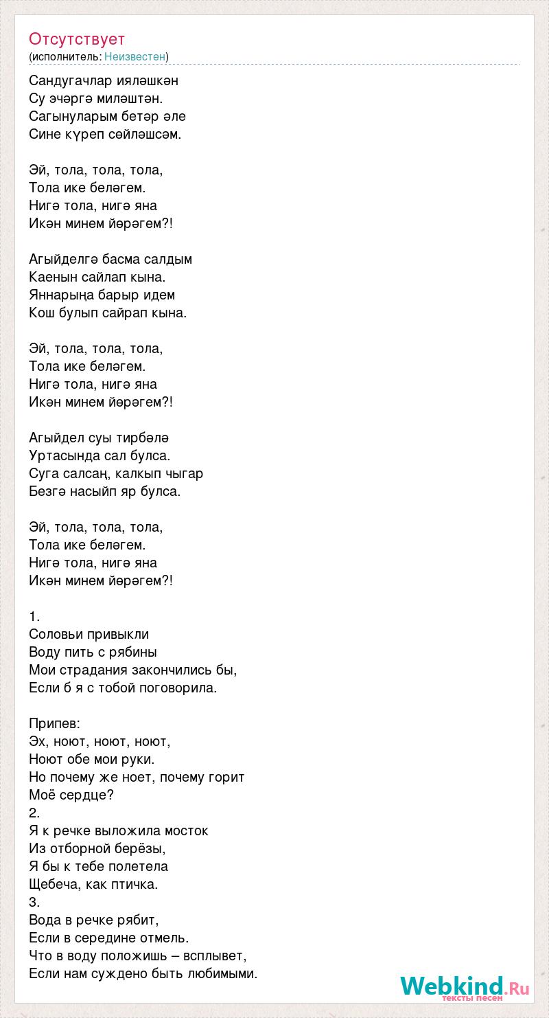 Сандугачлар ияләшкән Су эчәргә миләштән. Сагынуларым бетәр әле Сине күреп сөйләшсәм. Эй, тола, тола, тола, Тола ике беләгем. Нигә тола, нигә яна Икән минем йөрәгем?! Агыйделгә басма салдым Каенын сайлап кына. Яннарыңа барыр идем Кош булып сайрап кына. Эй, тола, тола, тола, Тола ике беләгем. Нигә тола, нигә яна Икән минем йөрәгем?! Агыйдел суы тирбәлә Уртасында сал булса. Суга салсаң, калкып чыгар Безгә насыйп яр булса. Эй, тола, тола, тола, Тола ике беләгем. Нигә тола, нигә яна Икән минем йөрәгем?! 1. Соловьи привыкли Воду пить с рябины Мои страдания закончились бы, Если б я с тобой поговорила. Припев: Эх, ноют, ноют, ноют, Ноют обе мои руки. Но почему же ноет, почему горит Моё сердце? 2. Я к речке выложила мосток Из отборной берёзы, Я бы к тебе полетела Щебеча, как птичка. 3. Вода в речке рябит, Если в середине отмель. Что в воду положишь – всплывет, Если нам суждено быть любимыми.