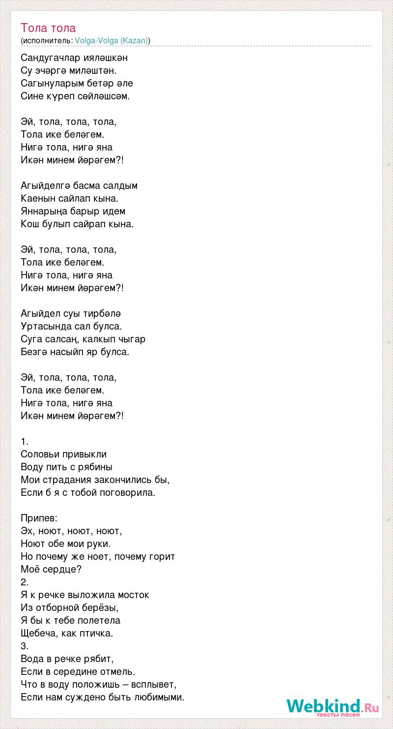 Сандугачлар ияләшкән Су эчәргә миләштән. Сагынуларым бетәр әле Сине күреп сөйләшсәм. Эй, тола, тола, тола, Тола ике беләгем. Нигә тола, нигә яна Икән минем йөрәгем?! Агыйделгә басма салдым Каенын сайлап кына. Яннарыңа барыр идем Кош булып сайрап кына. Эй, тола, тола, тола, Тола ике беләгем. Нигә тола, нигә яна Икән минем йөрәгем?! Агыйдел суы тирбәлә Уртасында сал булса. Суга салсаң, калкып чыгар Безгә насыйп яр булса. Эй, тола, тола, тола, Тола ике беләгем. Нигә тола, нигә яна Икән минем йөрәгем?! 1. Соловьи привыкли Воду пить с рябины Мои страдания закончились бы, Если б я с тобой поговорила. Припев: Эх, ноют, ноют, ноют, Ноют обе мои руки. Но почему же ноет, почему горит Моё сердце? 2. Я к речке выложила мосток Из отборной берёзы, Я бы к тебе полетела Щебеча, как птичка. 3. Вода в речке рябит, Если в середине отмель. Что в воду положишь – всплывет, Если нам суждено быть любимыми.